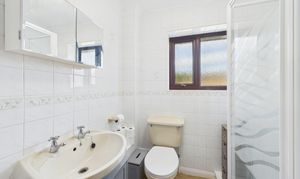 Frosted window to rear, shower cubicle with mixer tap shower over, low level W/C, wash basin with individual taps over, with heated towel rail, wood effect vinyl flooring, and door to airing cupboard housing the hot water cylinder.