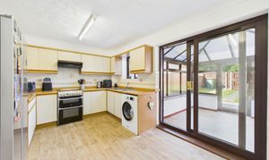 Window to rear, matching wall and base units with worktop over, inset 1 bowl sink unit with mixer tap over, tiled splashbacks, space for American style fridge / freezer and washing machine, a new wall mounted gas fired boiler fitted in summer 2025 with a 7 year warranty*, with radiator, wood effect vinyl flooring, and patio door to conservatory.