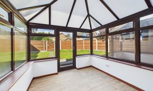 Windows to all sides, low level wall surround, with wood effect vinyl flooring, and door to rear garden.