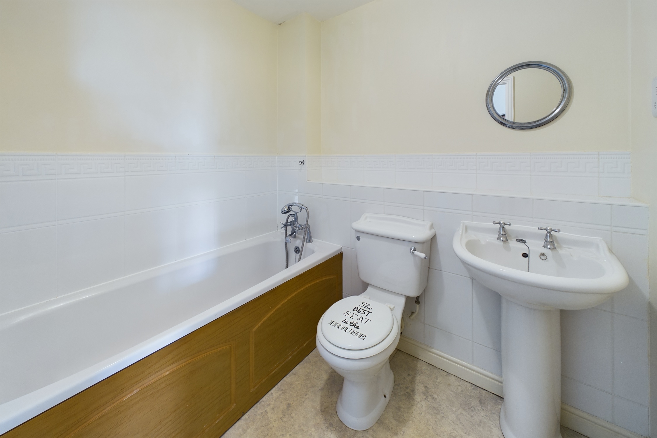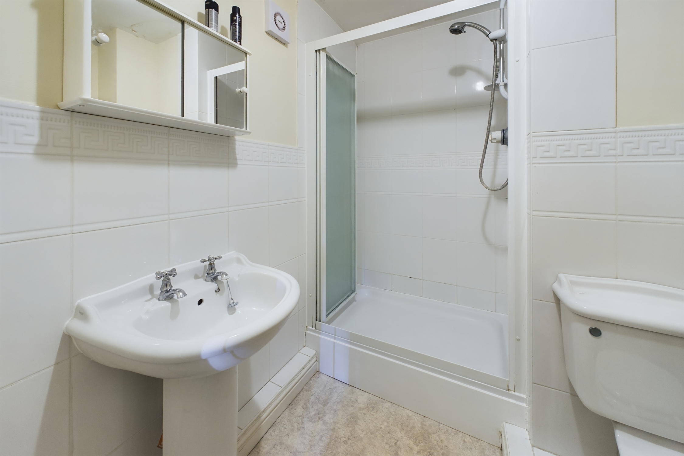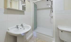 Consisting of White Suite, Mains Shower over Bath, Electric Shaver Socket, One Radiator, Extractor Fan.