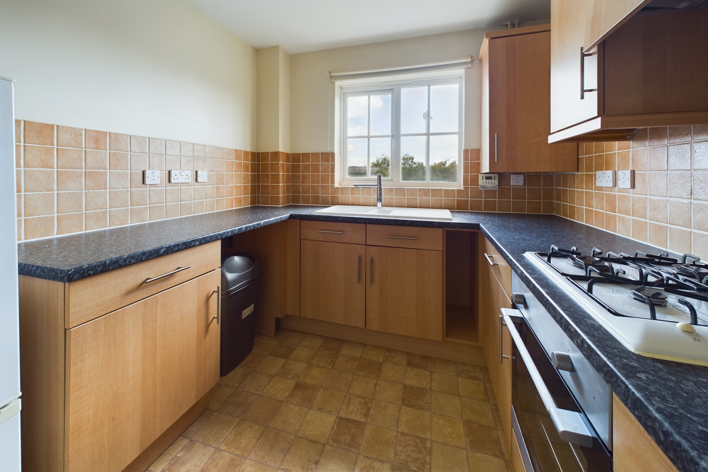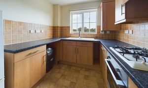 Wall and Base Units, Integrated Electric Cooker with Gas Hob and Extractor Over, Ceramic Half Bowl Sink with Mixer Tap Over, Window to Front and Vinyl Floor, One Radiator.