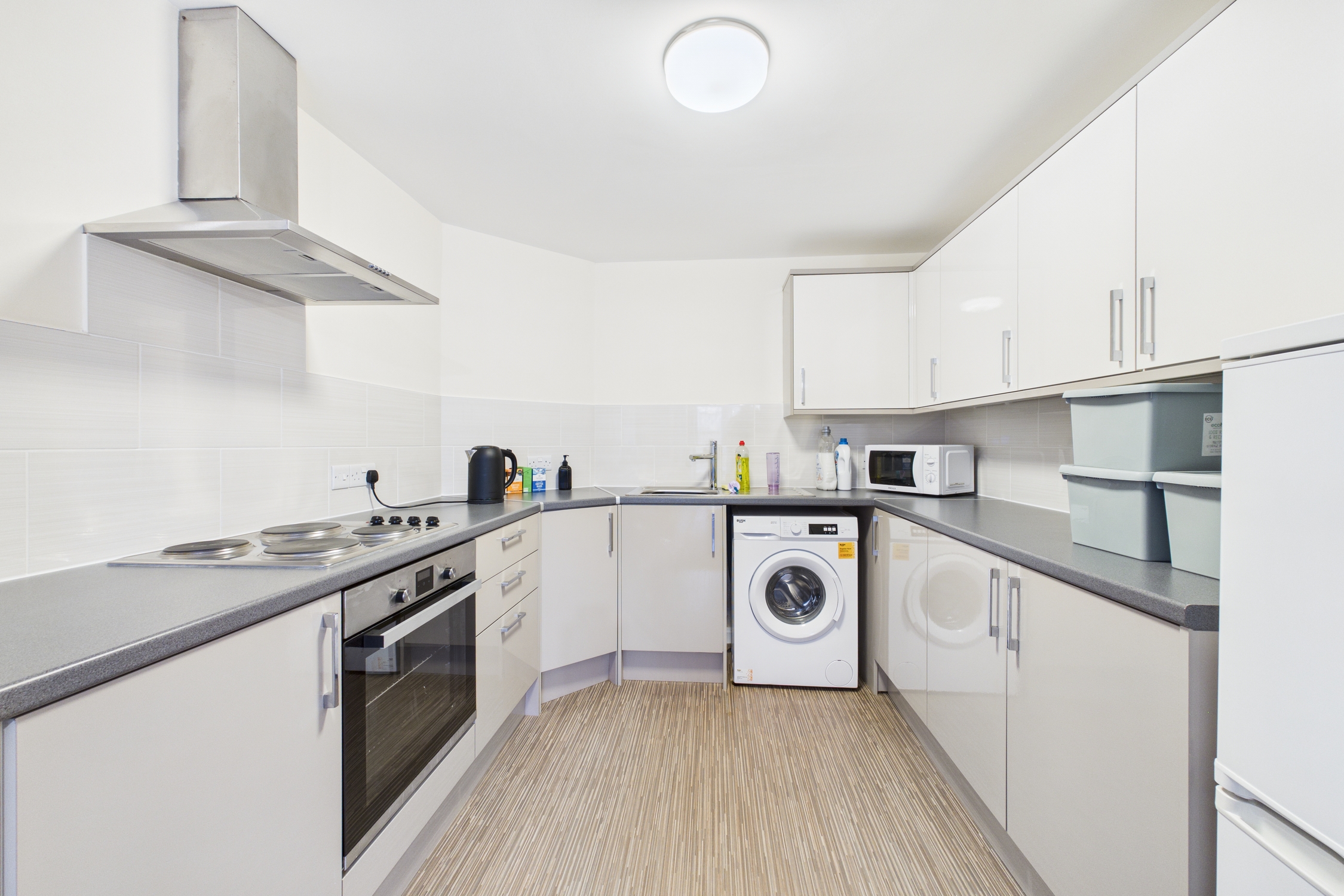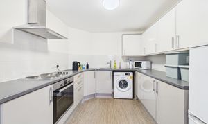 Fitted with a range of base and wall mounted units, roll edge work surface with inset sink and mixer taps, built in oven, hob and extractor hood, space for upright fridge freezer, space and plumbing for washing machine.