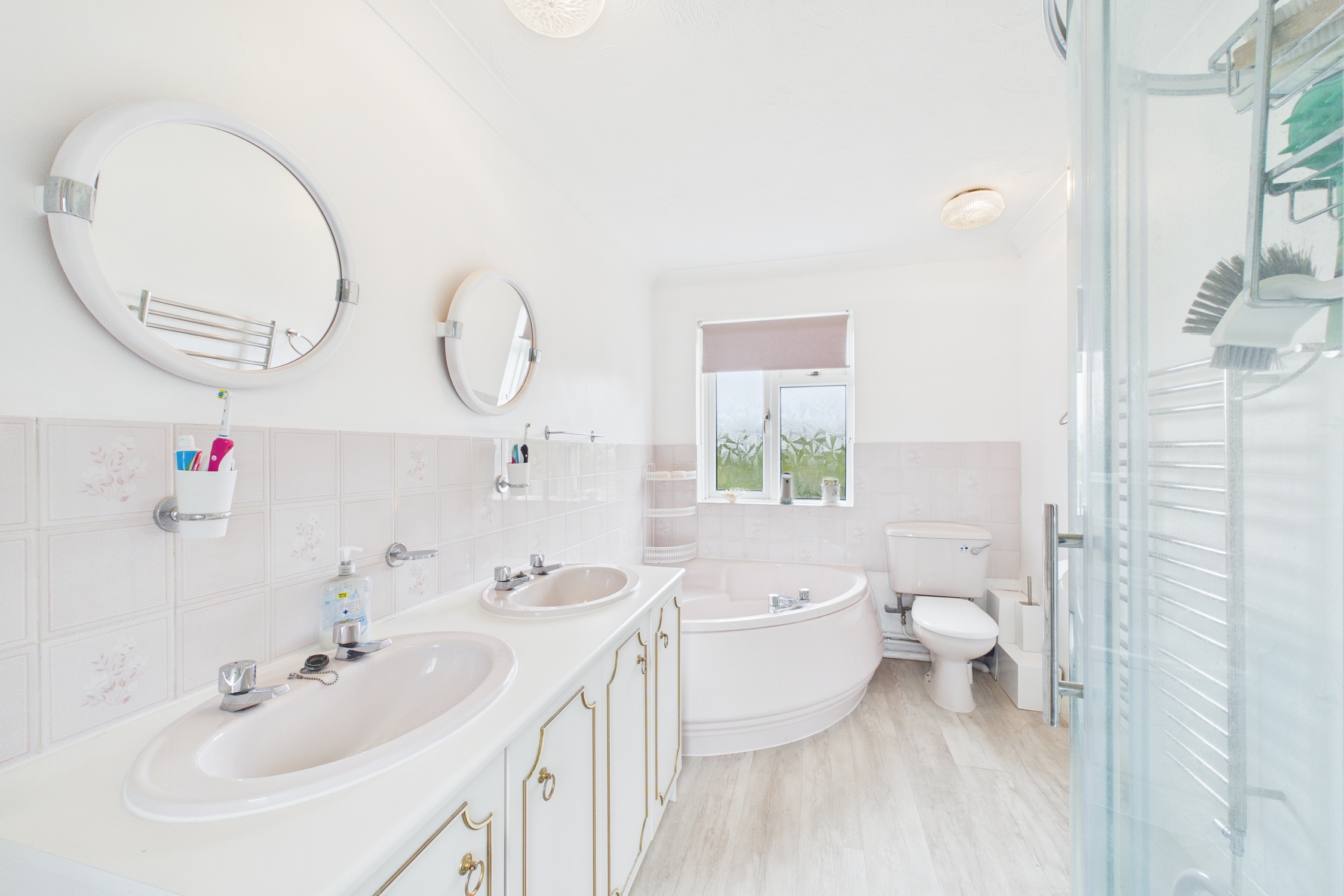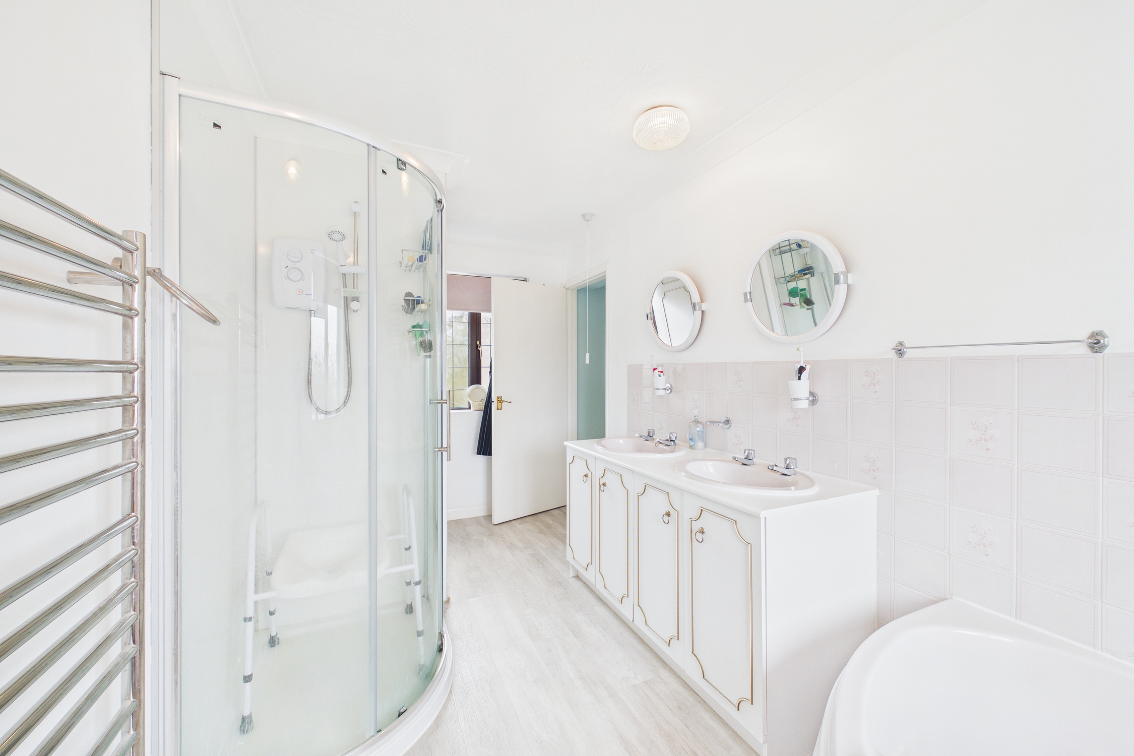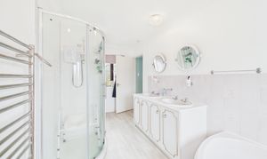 Frosted windows to front and rear, bath with mixer tap over, separate shower cubicle with electric shower over, double wash basin with individual taps over and vanity storage beneath, with heated towel rail, wood effect vinyl flooring, and doors to storage cupboard housing the hot water cylinder.