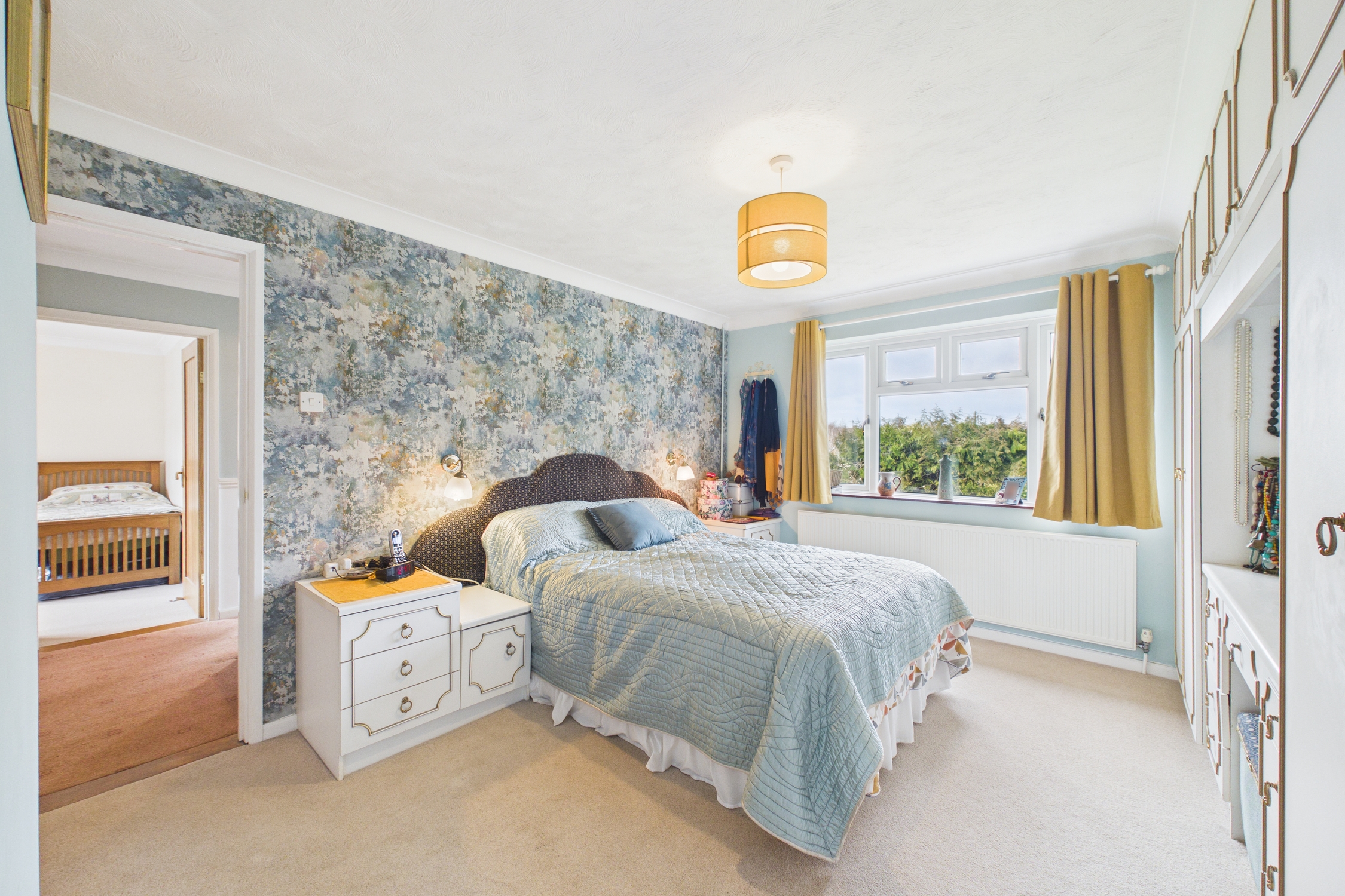 Window to rear, built-in wardrobes and dressing table, with radiator, carpet flooring, and door to en-suite.