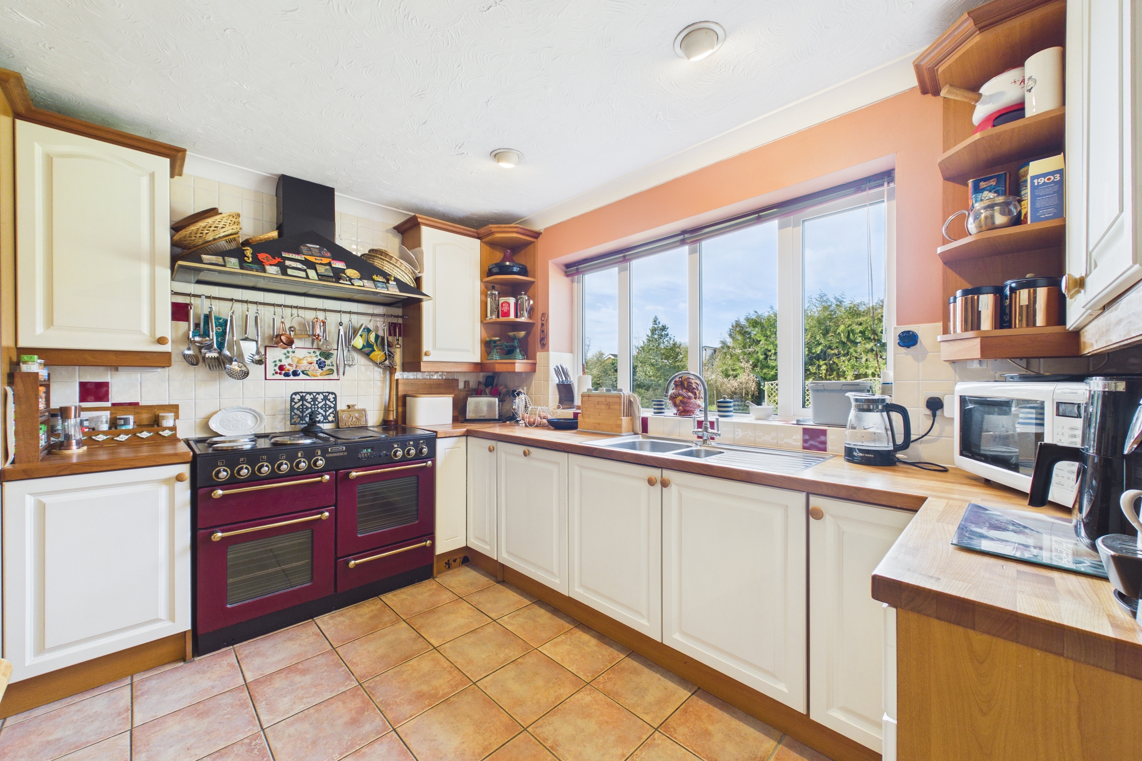 Window to rear, matching wall and base units with worktop over, inset 1.5 bowl sink unit with mixer tap over, tiled splashbacks, integrated fridge / freezer, and dishwasher, space for freestanding cooker with cooker hood over, with radiator, tiled flooring, and door to utility room.