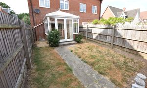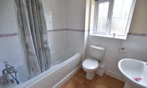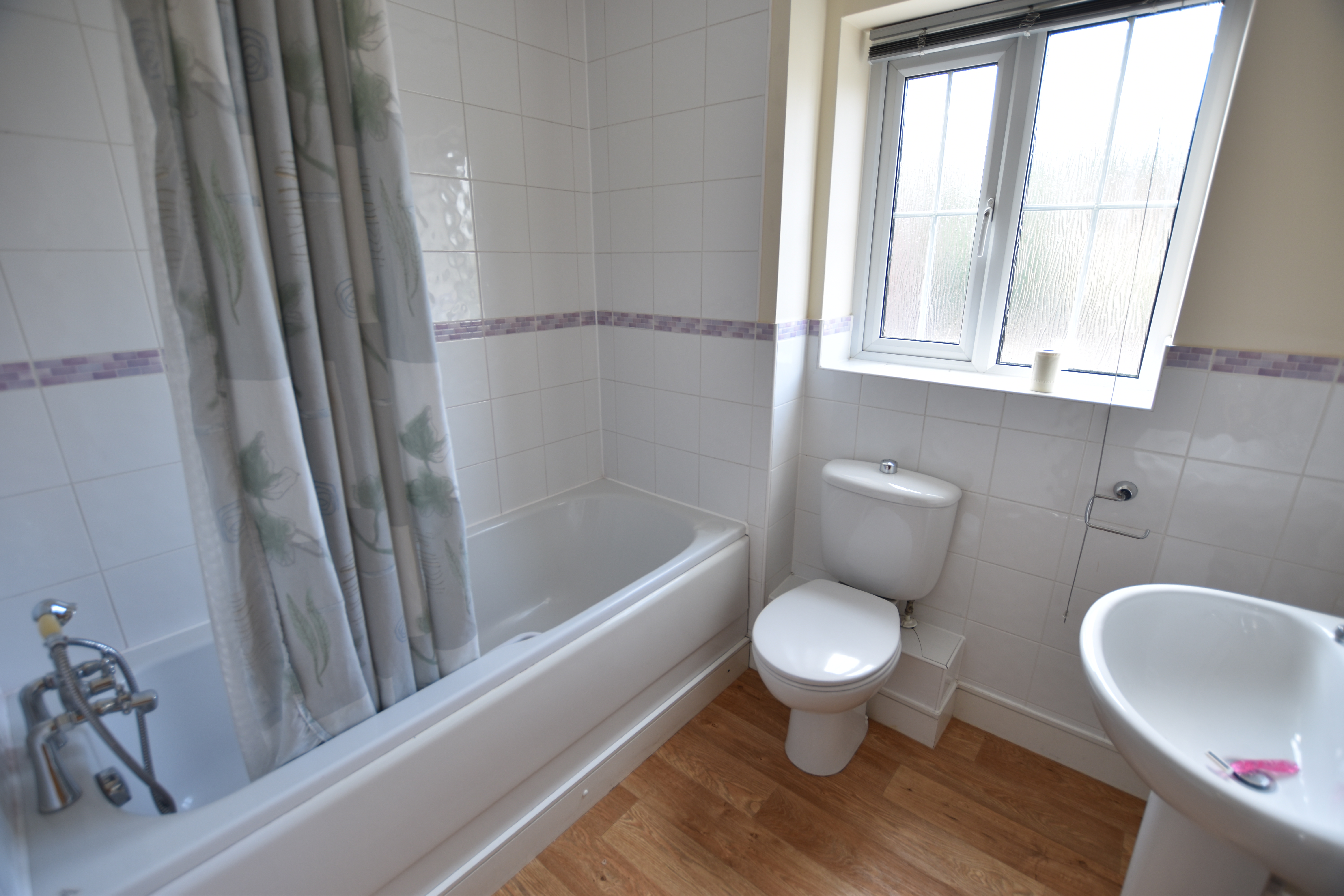 Suite comprising low level W.C, pedestal wash hand basin, panel enclosed bath with mixer taps and shower attachment, frosted double glazed window to front