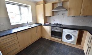 Fitted with a range of wall mounted and base units with worksurface over, inset stainless steel sink and drainer unit with mixer tap over, built in oven, hob and extractor hood, integrated dishwasher, washing machine and fridge/freezer, tiled flooring, double glazed window to front