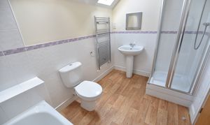 Suite comprising low level W.C, pedestal wash hand basin, panel enclosed bath with mixer taps and shower attachment, separate shower cubicle, Velux window