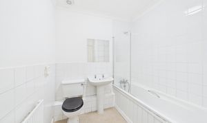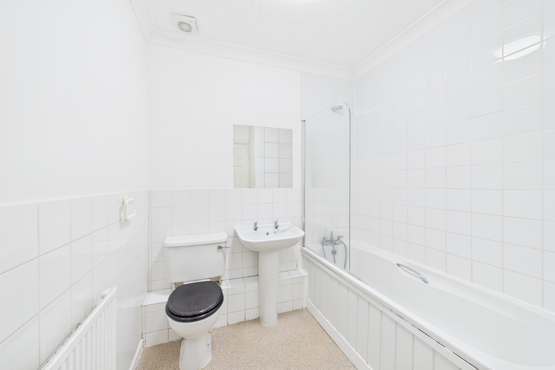 Bath unit with mixer tap and shower attachment over, low level W/C, wash basin with individual taps over, partial wall tiling, with radiator, and vinyl flooring.