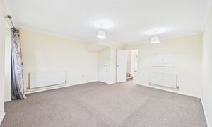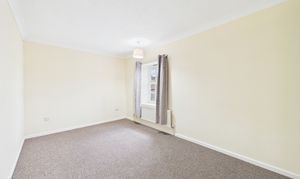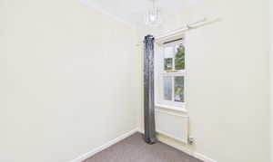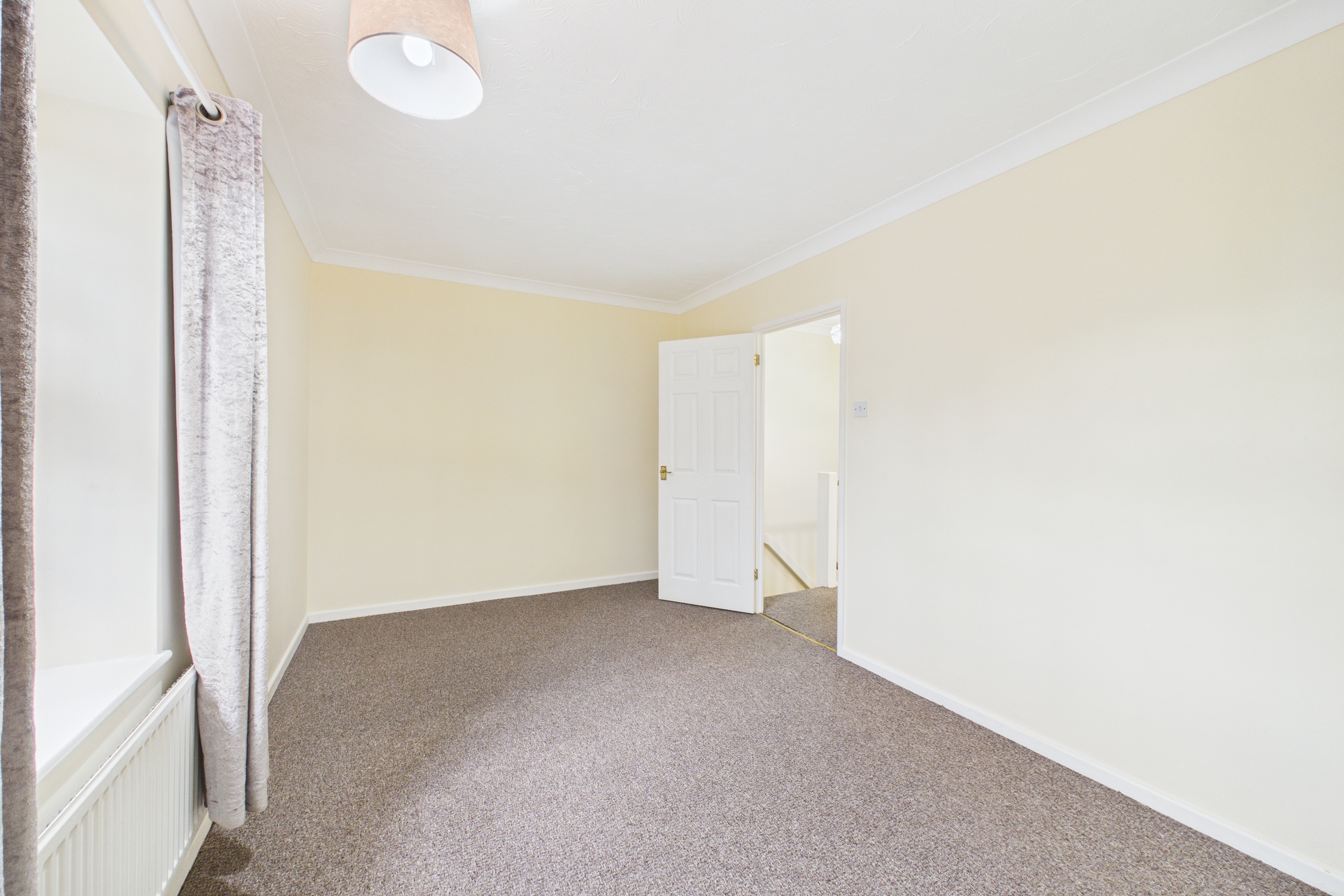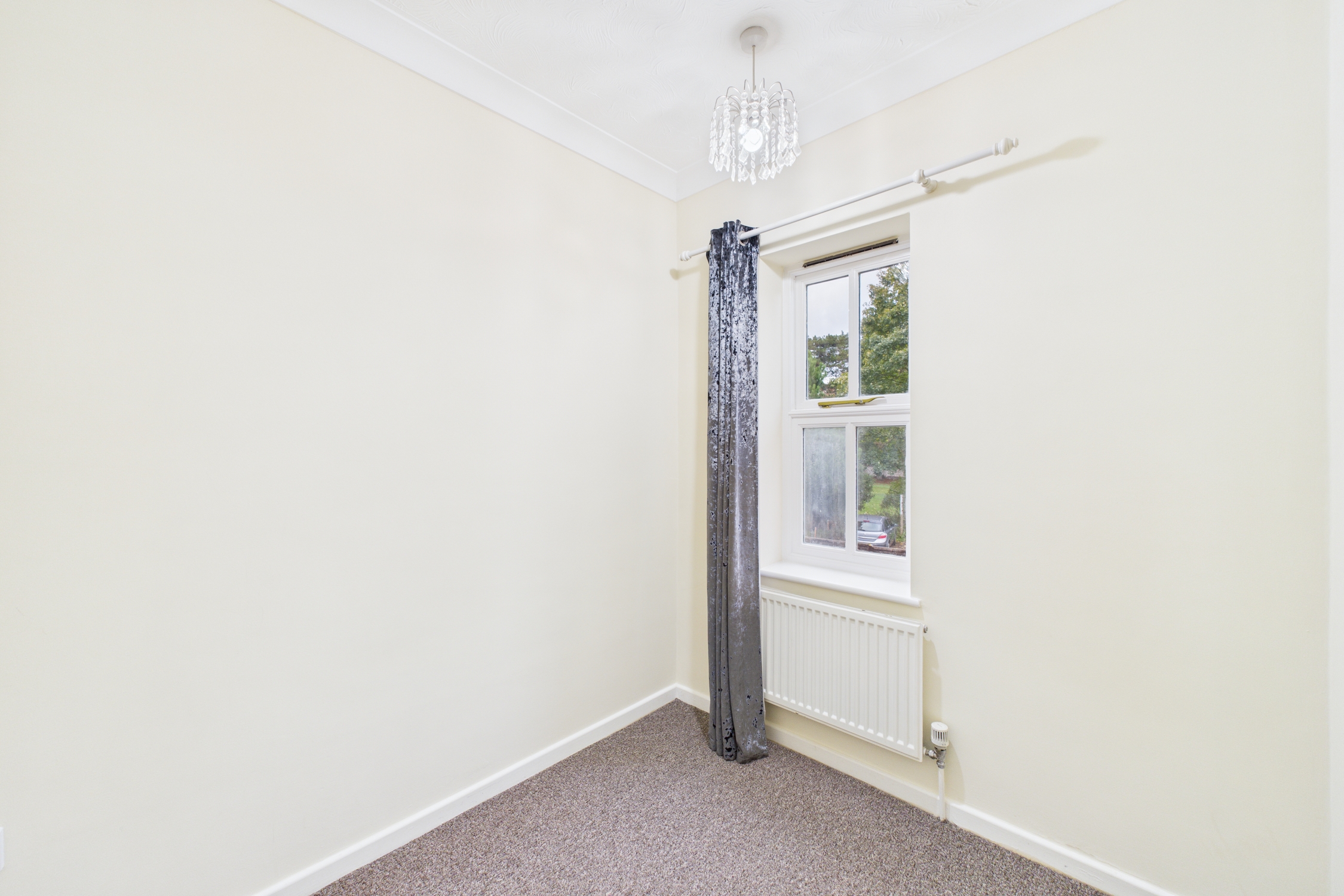 Window to rear, with radiator, carpet flooring, and access to loft via ceiling hatch.