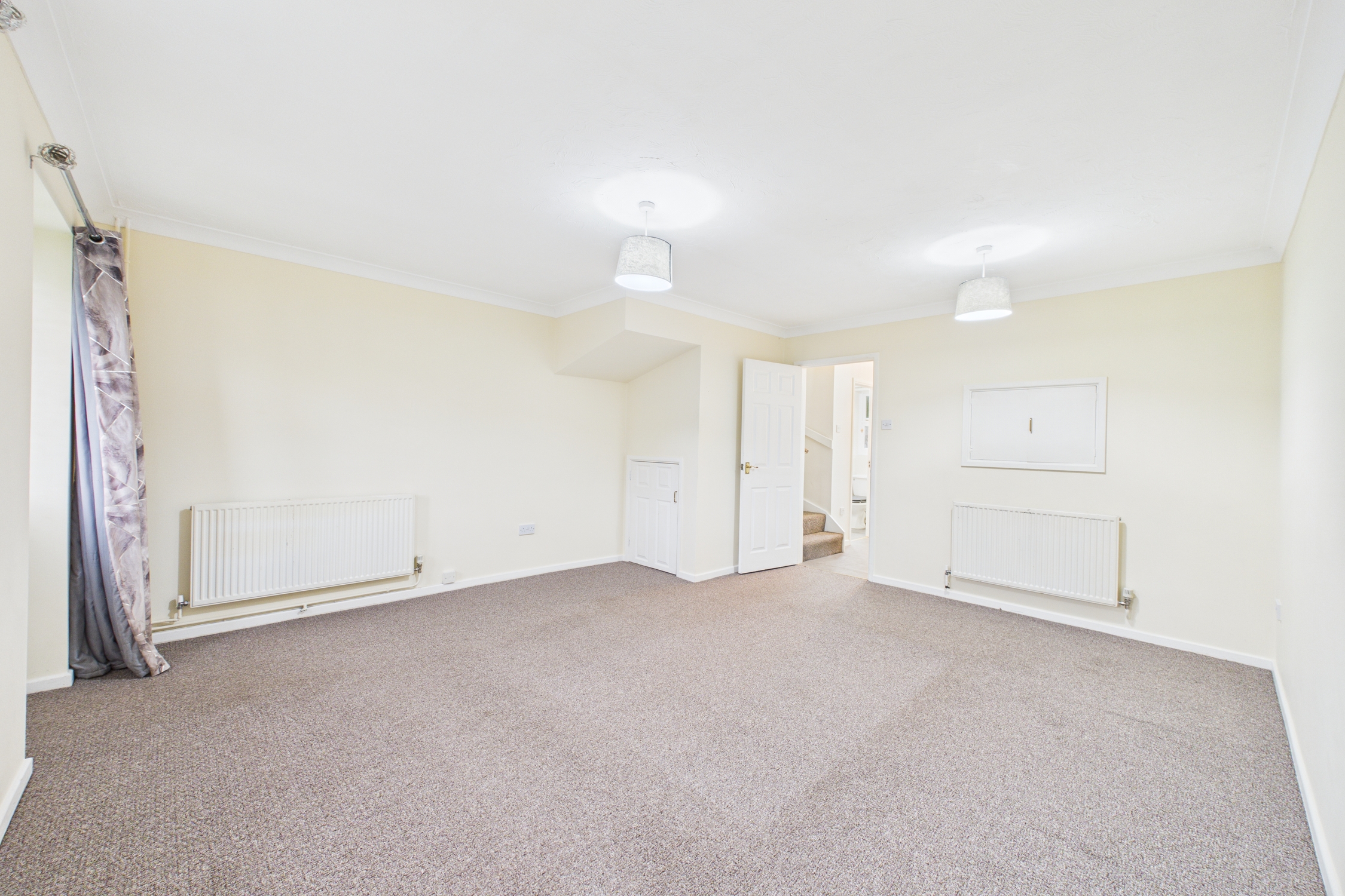 Window to front, with radiator, carpet flooring, serving hatch to kitchen, and doors to understairs storage cupboard and hallway.
