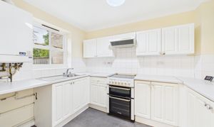 Window to rear, wall and base units with worktop over, inset 1 bowl sink unit with mixer tap over, tiled splashbacks, wall mounted gas fired combination boiler, space for freestanding cooker with cooker hood over, washing machine, and fridge / freezer, with radiator, and vinyl flooring.