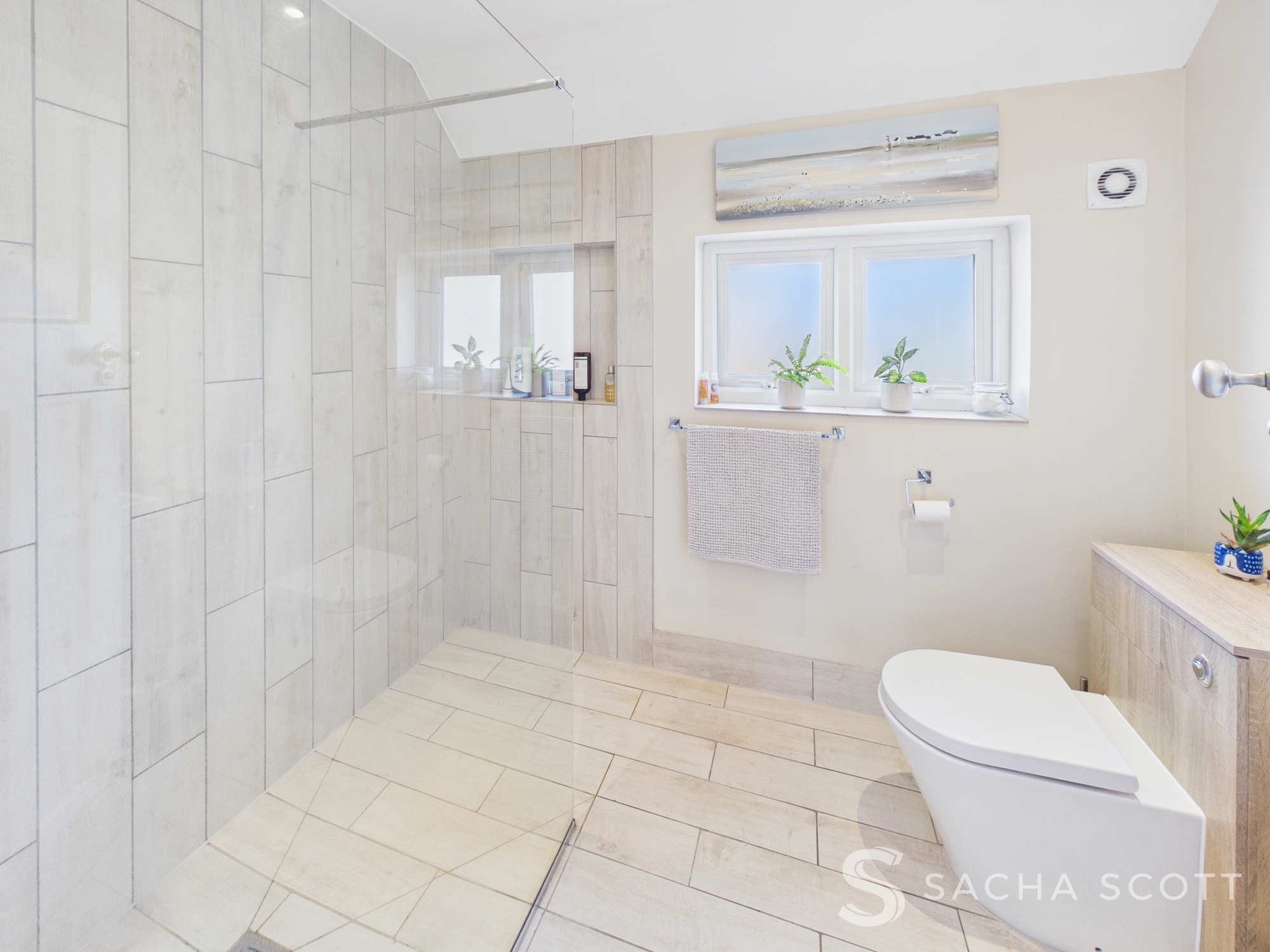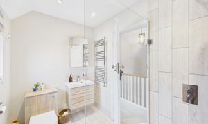 Fully tiled, the shower room offers a large walk-in shower, a vanity sink unit, WC and a heated towel rail.