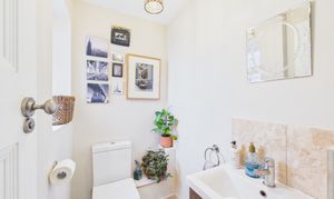 Located off of the home office/playroom, the guest WC offers neutral decor, a sink, WC and radiator.