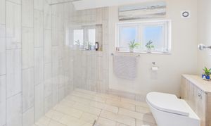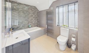 Located adjacent to the primary bedroom, this bathroom could be included as part of the primary suite, with the addition of a door on the corridor, should the new owner wish. Fully tiled in modern grey, this good sized bathroom offers a shower over bath with screen, vanity sink unit, WC and a heated towel rail.