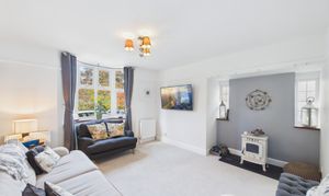Overlooking the front of this gorgeous family home, this good sized lounge benefits from modern decor, dual aspect windows to the front (bay) and side and a wood burning stove.