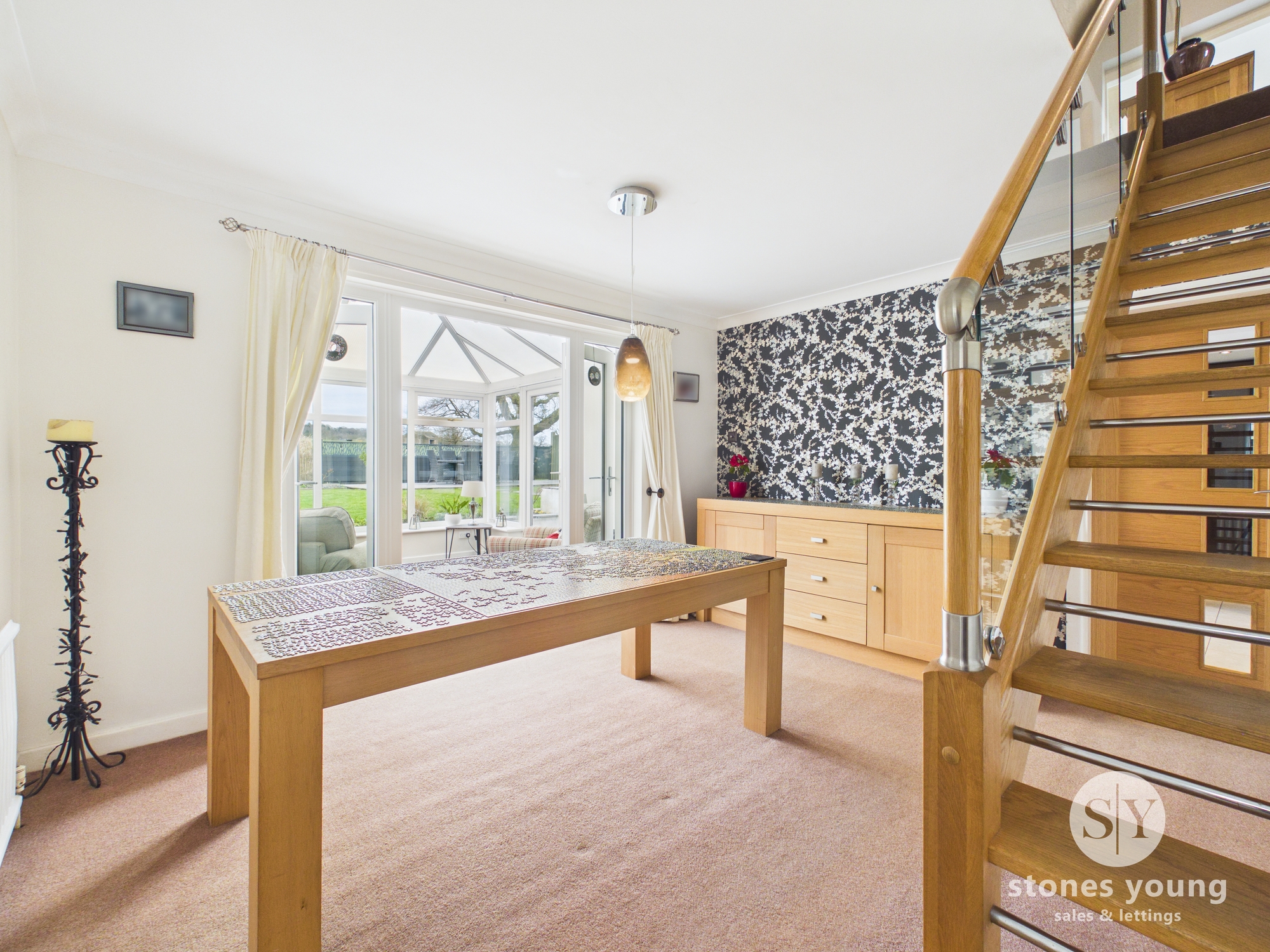Carpet flooring, stairs to first floor with glass balustrade, panel radiator, upvc double glazed French doors to conservatory
