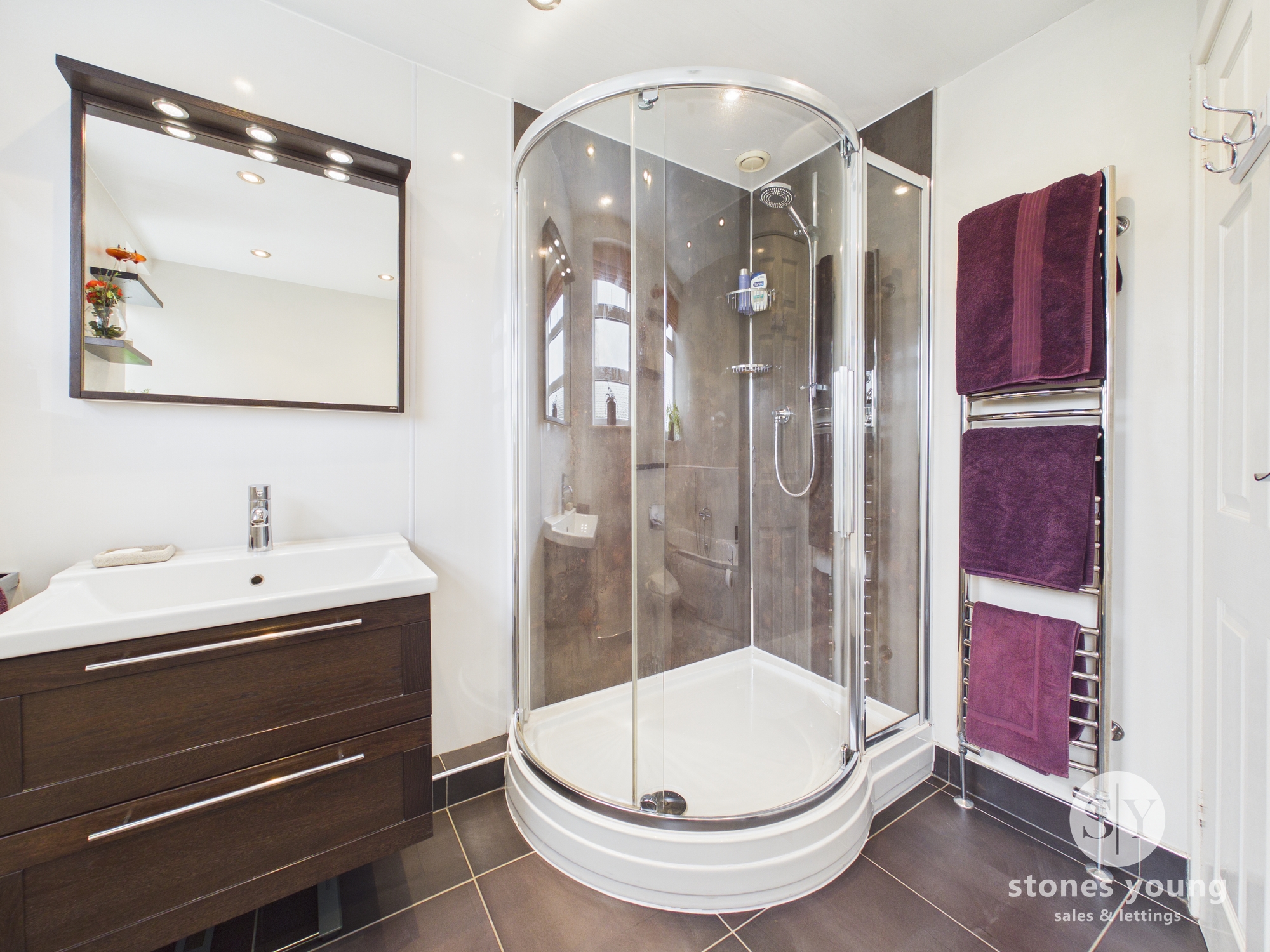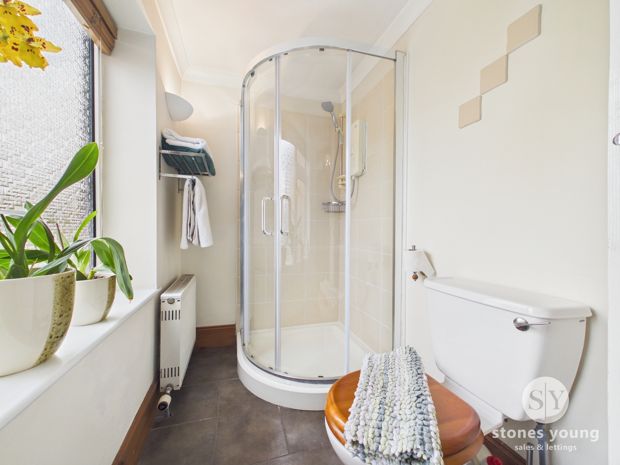 Three piece suite with shower enclosure, sink and wc, panel radiator, tiled flooring, upvc double glazed frosted window