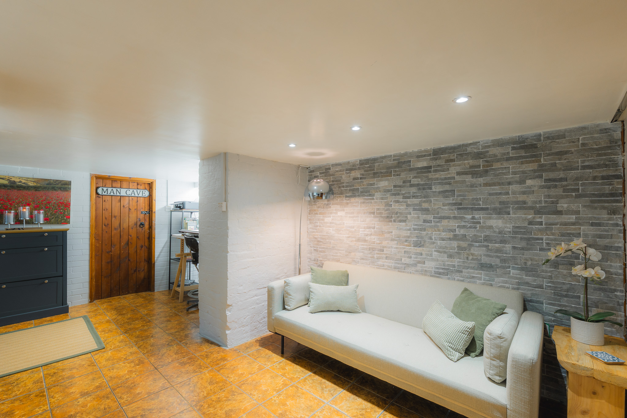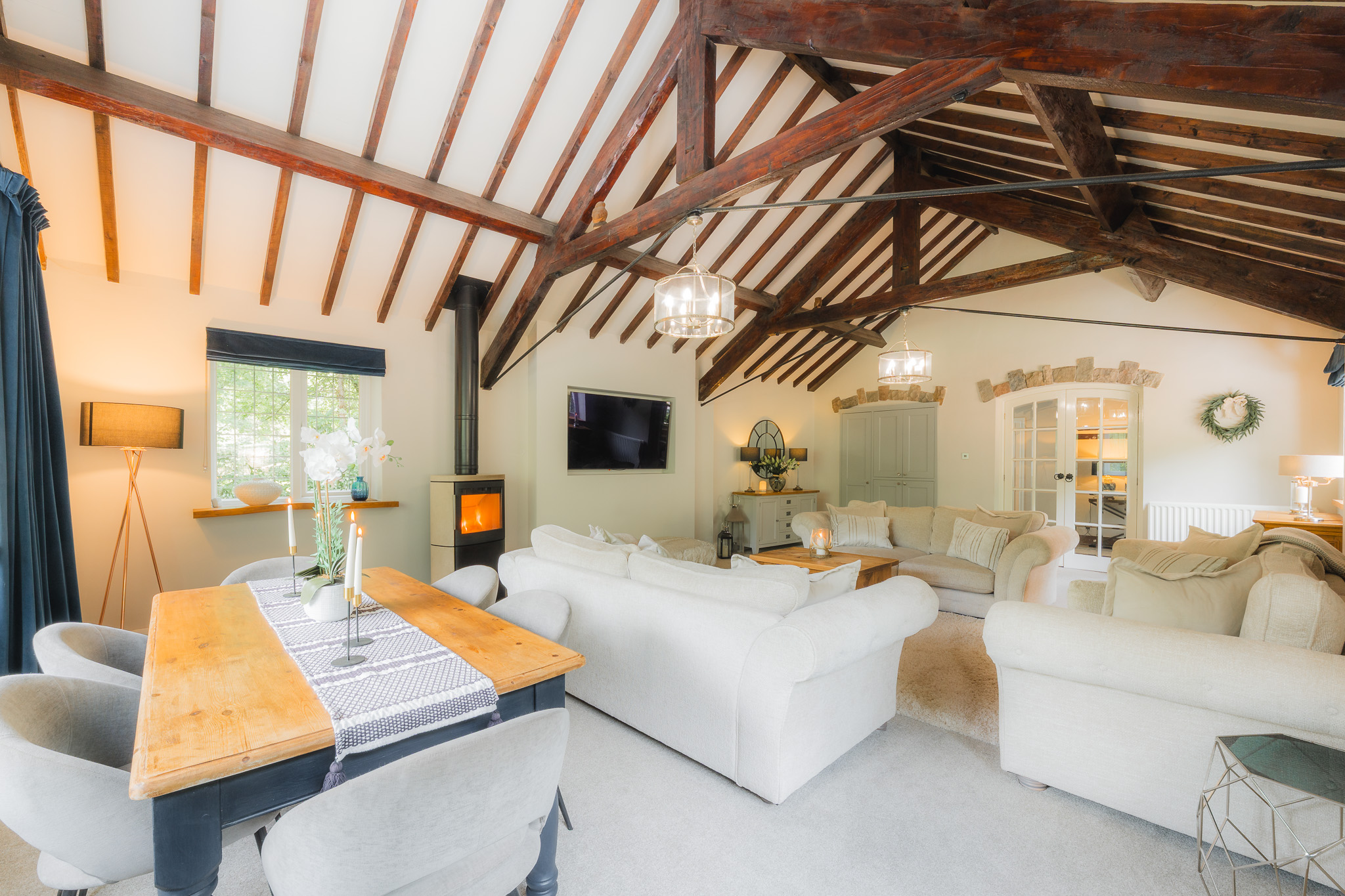 Around the room, original lintel stones frame former openings, while the wide end window floods the space with daylight. Recently redecorated and fully insulated with Kingspan, this lounge balances comfort and scale and serves as the perfect setting for festive gatherings or relaxed summer evenings.