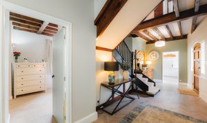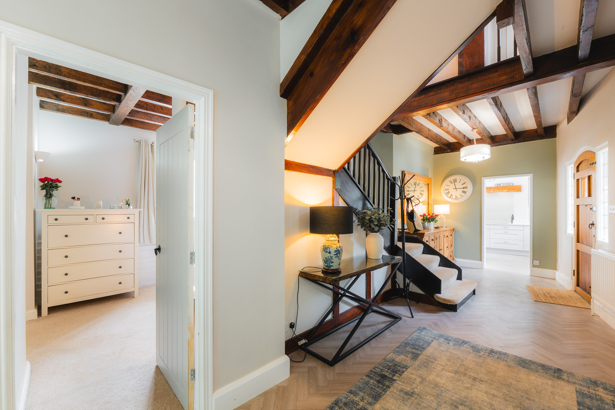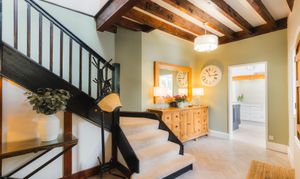 Stepping inside, the entrance hall balances country heritage with a streamlined, contemporary finish, dressed in calming, warm grey shades of Farrow & Ball’s Skimming Stone. Treacly toned beams embellish the ceiling above, harmonising with the handsome carved staircase, rising up to the first-floor gallery landing from the centre of the room. Underfoot, herringbone LVT flooring extends out, flowing through into the kitchen on the right.