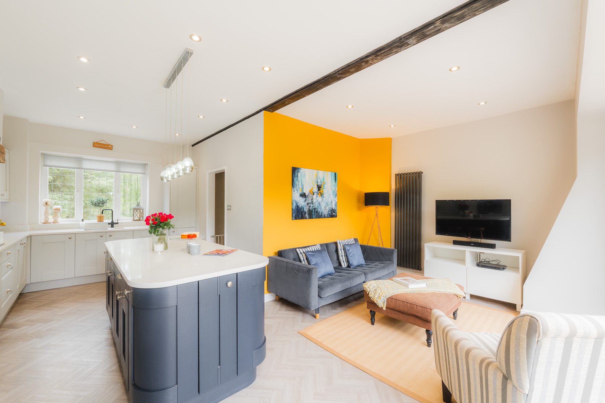Round the corner, the kitchen continues into a cosy snug whose mustard feature wall adds a playful, modern twist. Perfect for enjoying coffee, with views out across the patio and lush laurel hedge, in the morning, sunlight streams through. By evening, the patio outside basks in golden glow.