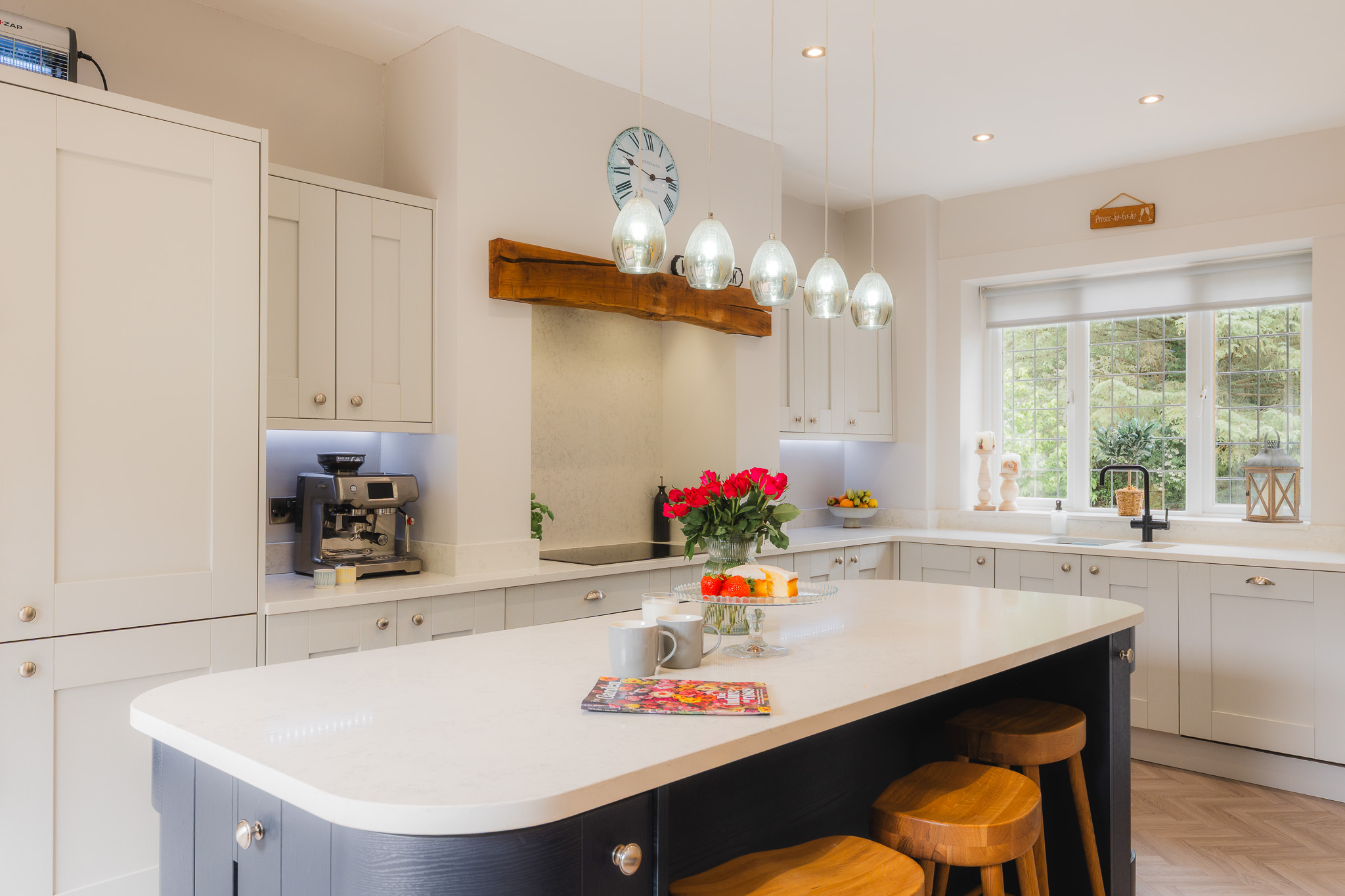 At the centre of the kitchen, beneath the glow of pendant lights, the sociable curved-edge island is a natural gathering spot whether hosting summer soirees or sharing a swift breakfast on the go. Above the induction hob, the classic inglenook with an exposed timber beam balances rustic warmth with sleek modern finishes.