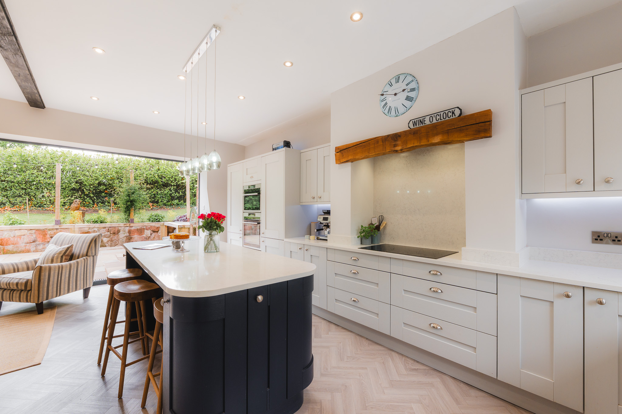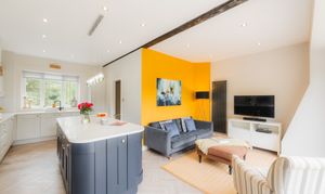 Appliances include a larder fridge, Neff dishwasher and microwave oven, with the dedicated utility room just downstairs. With an effortless flow, designed with entertaining in mind, bifolding doors open to the garden and outdoor dining area.