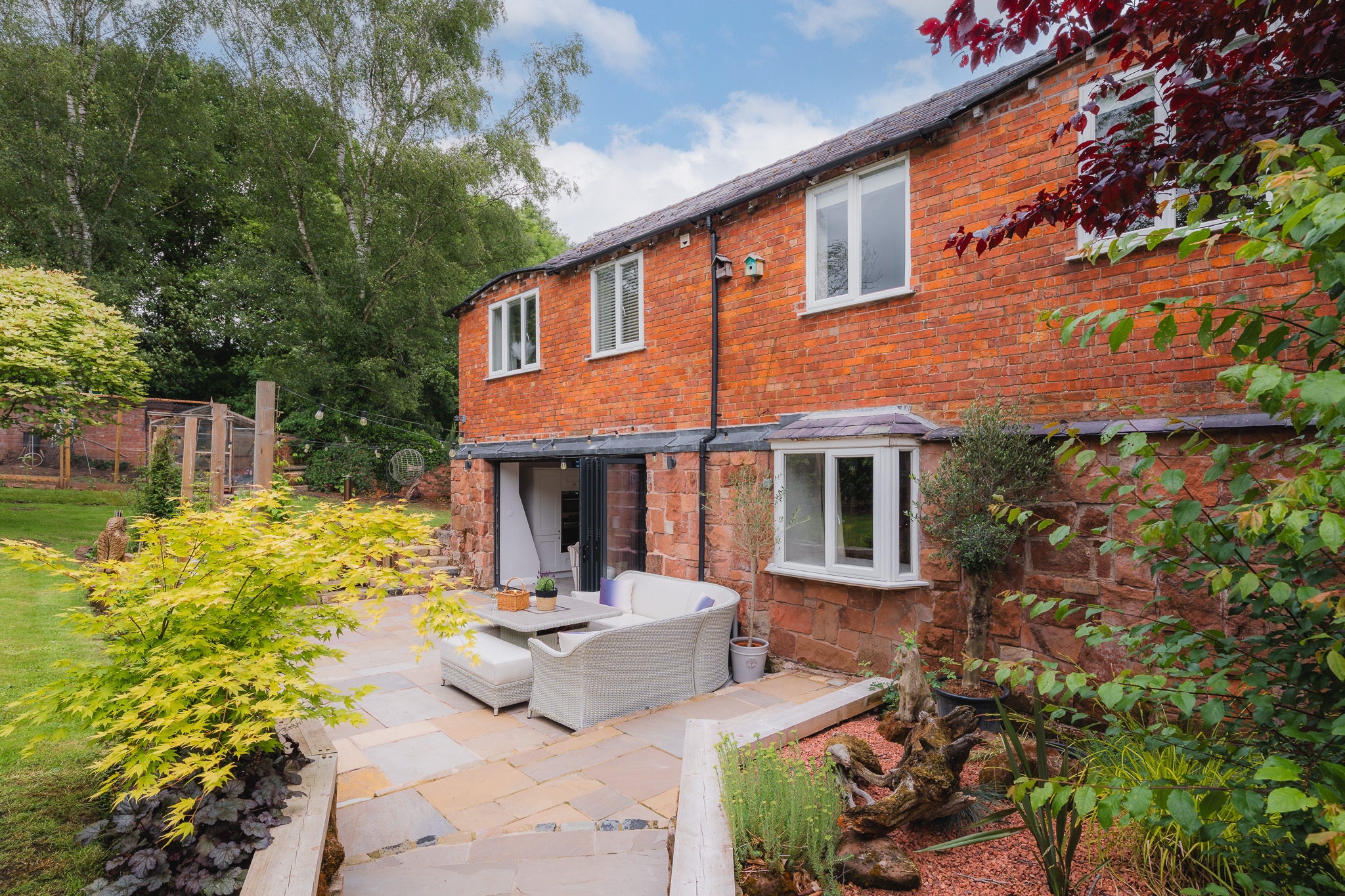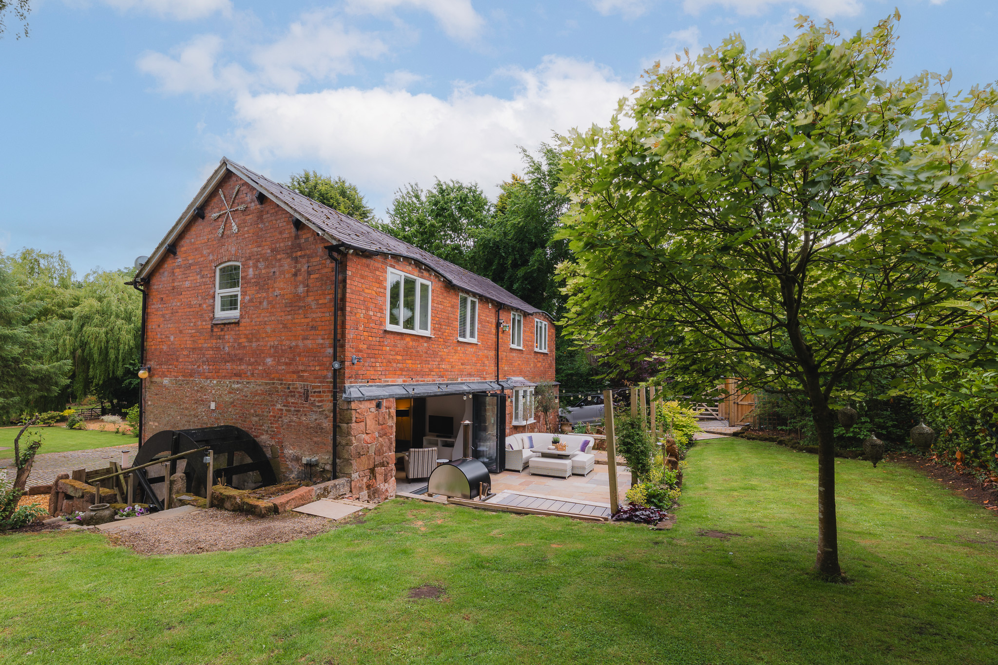 Outdoors, the garden unfolds, transitioning from the rear patio - once the site of the old mill pond, resting within angled retaining walls built to hold back water, millstones still embedded in the stonework - beyond gravel paths and cobbles to vegetable beds and lawns perfect for children’s play.