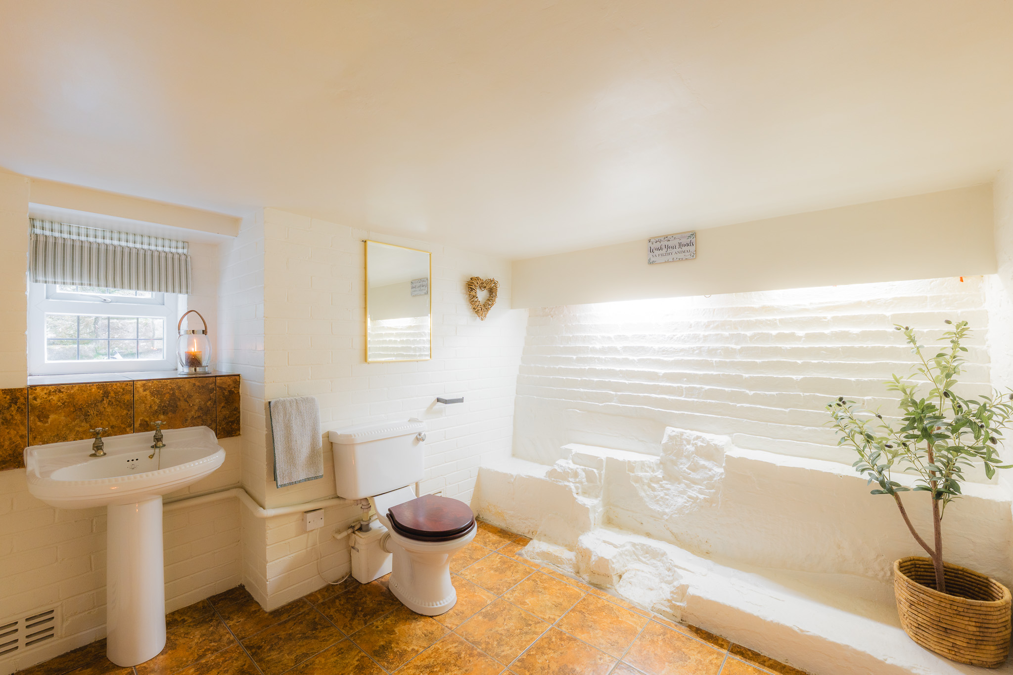 In tune with its past, characterful features reside within the very stone of The Old Mill, subtle markers of times gone by, as displayed in the cloakroom on the lower level. The oldest part of the home, original walls and stony outcrops are illuminated by inset lighting, celebrating the heritage of the home. A large room, with Saniflo system in place, alongside wash basin and WC, there is scope to install a shower.