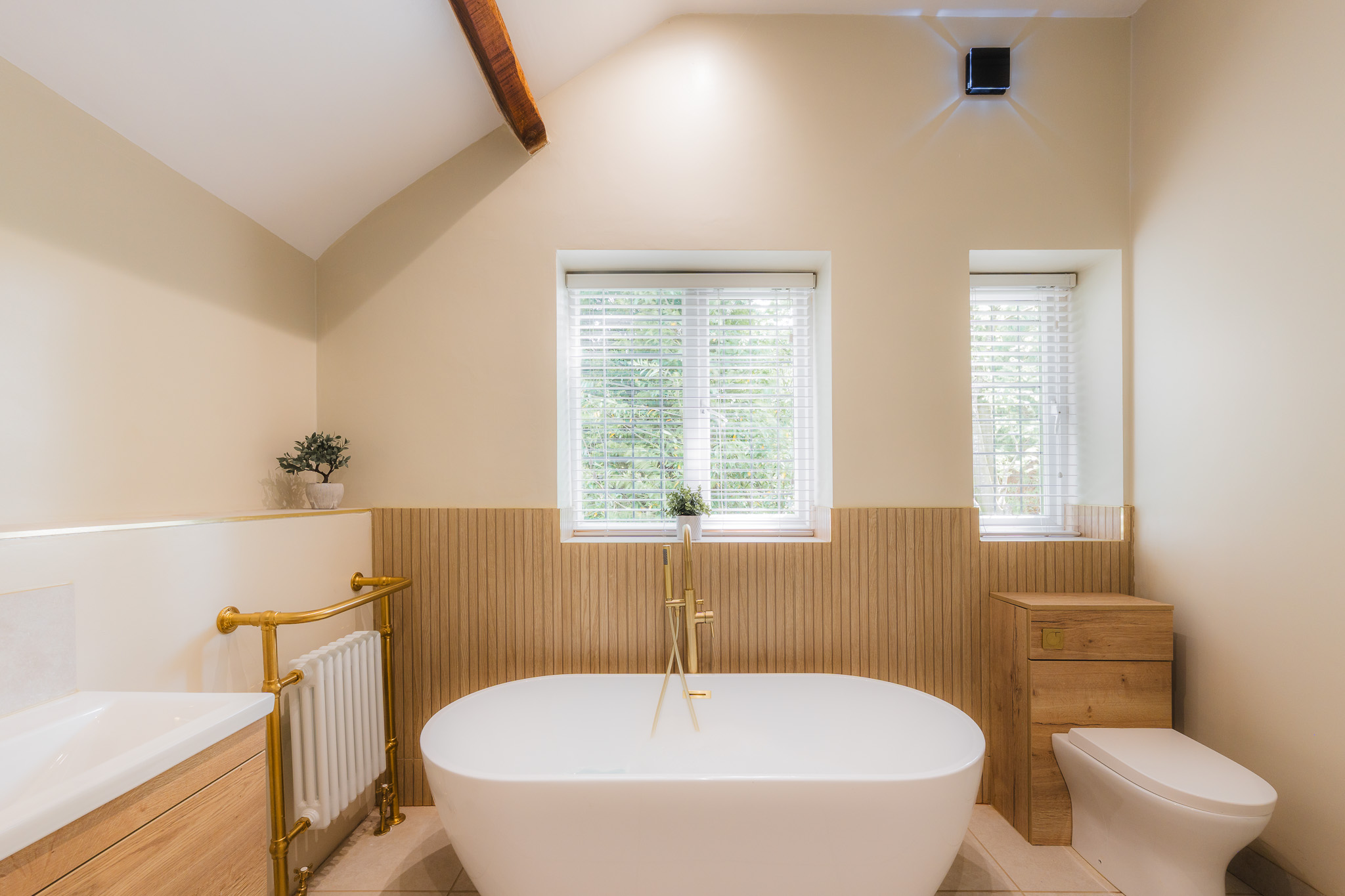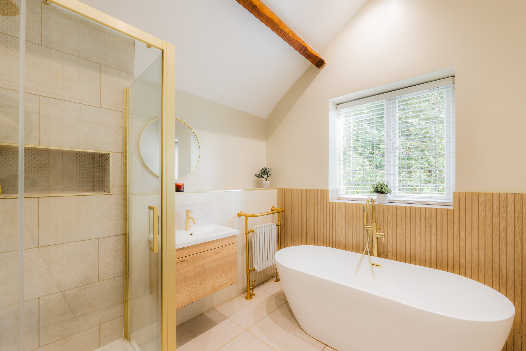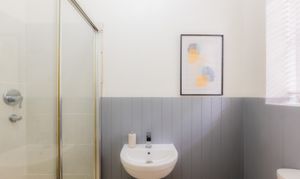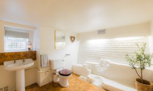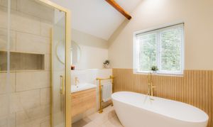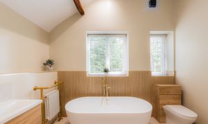 Refresh in the main family bathroom to the right, again set beneath a soaring ceiling and dressed in soothing, spa-like shades. Fitted within the last five years along with all the bathrooms, soak away the aches in the free-standing bath or begin the day with a refreshing spritz in the shower.