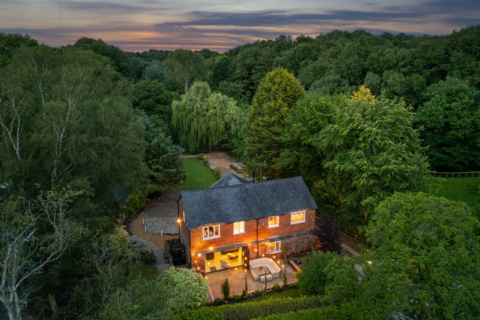 Stretching to around two acres, the garden envelops the home, providing space for play, relaxation and even the potential for revenue. Positioned along a quiet a bridle path, walks unfold on the doorstep. An idyllic setting, there is scope to add a stable block and keep ponies, to convert the cellar level into an annexe or standalone accommodation. Whether kept as a private haven or shared as a destination, The Old Mill with its lush grounds holds natureand business potential in equal measure.