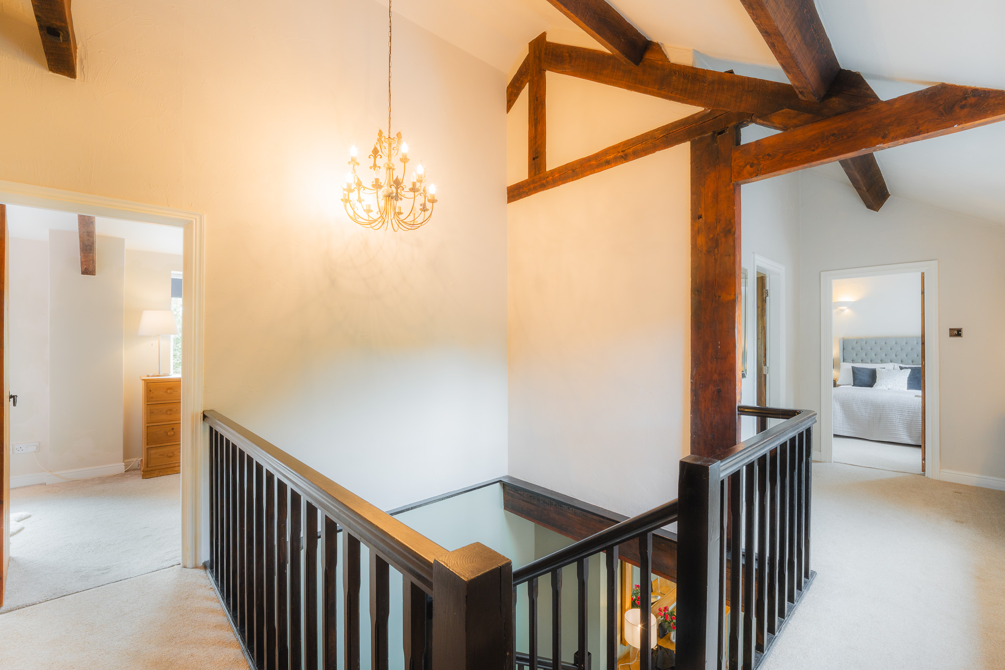 Returning to the ground floor, ascend the stairs to the first-floor gallery landing where beams furnish the vaulted ceiling high above.