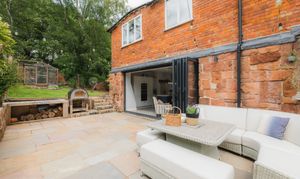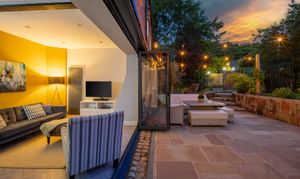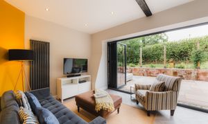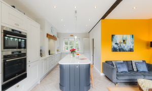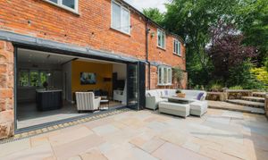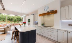 - Contemporary kitchen space with bi-folds out to a landscaped sunny patio terrace