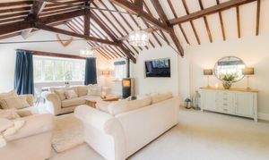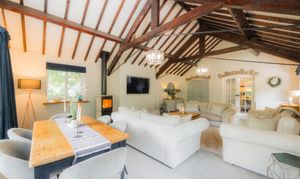 Stepping into the lounge on the left, the soaring vaulted ceiling, crisscrossed with exposed beams is an impressive and architecturally striking sight, echoing the home’s former life as a working mill. Originally an open room where flour was once stored and loaded onto horse-drawn carts, the lounge has been transformed into a vast yet inviting living space.