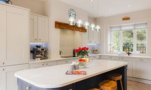 Refurbished in 2022, the kitchen continues the calming palette of soft grey with storage in abundance in the contemporary country cabinetry, paired with white quartz worktops that reflect the natural light pouring in through expansive bifold doors.