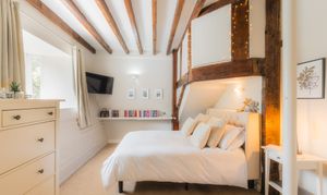 Across the entrance hall, discover the first of the four bedrooms. Built-in wardrobes provide plenty of storage, with quaint beams and arches. Once a study, this versatile room offers leafy views out to the garden and also features its own shower room ensuite.