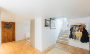 Built into the gentle lilt of the land, stairs lead down from the entrance hall, past the full height window overlooking the trees and driveway, to the lower ground level, a highly versatile space with vast potential for independent living.