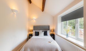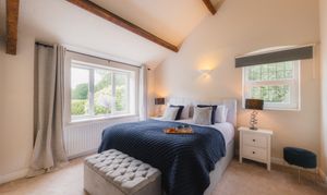 Coming out of the bathroom, on the left, discover the second of the spacious double bedrooms at The Old Mill, where ample storage awaits in the fitted wardrobes. Large windows capture views out over the countryside, whilst beams remain an ever-present sight above.