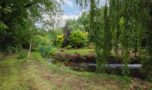 Beyond the lawn, a weeping willow dips towards the brook that weaves through the grounds, its melodic sound merging with birdsong under the tree canopy. Hunkered down and nestled in a microclimate of its own, the garden attracts buzzards overhead and kingfishers by the brook; a true haven for nature.
