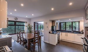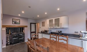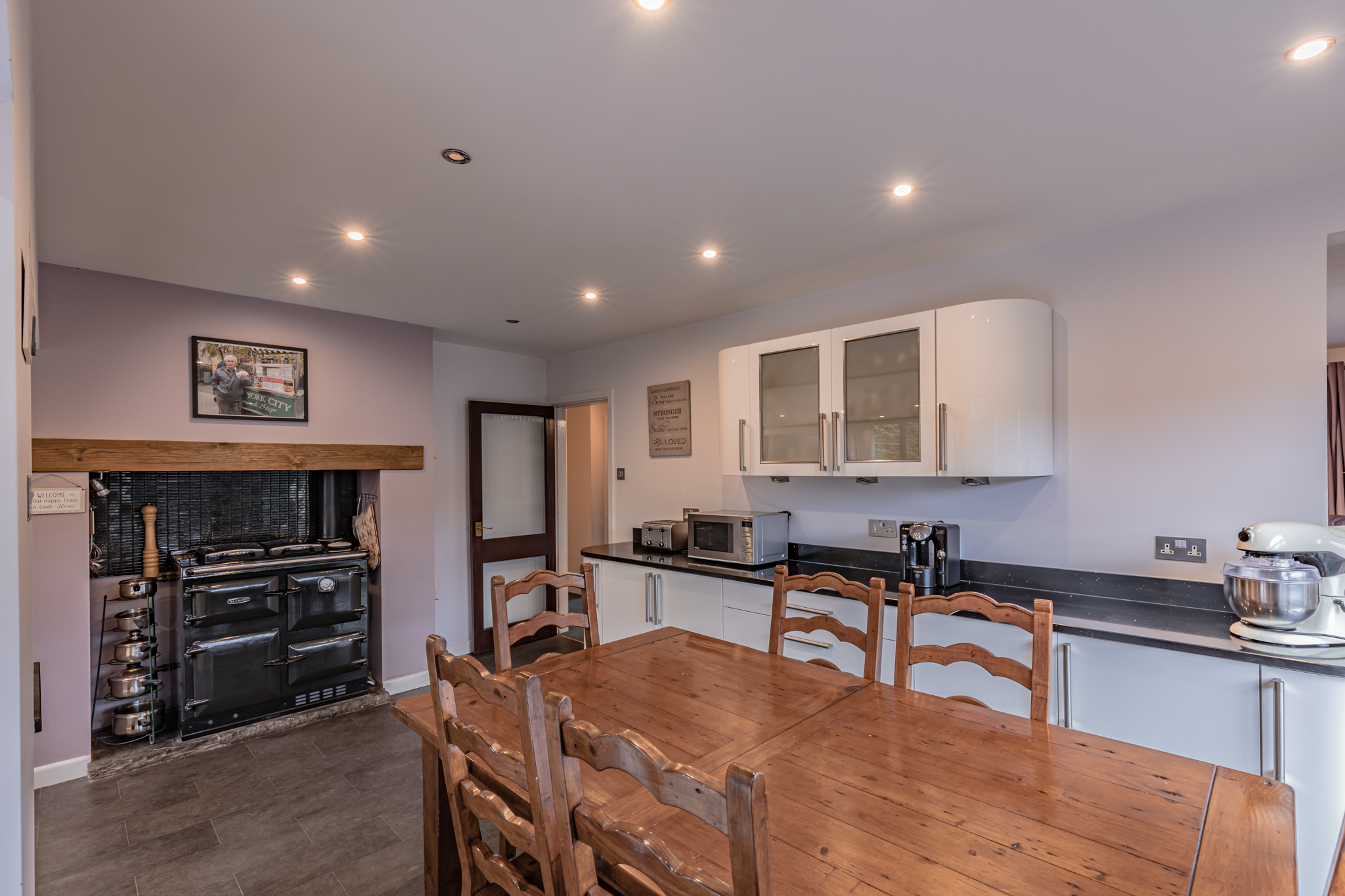 Directly ahead from the front door, wander through into the dining kitchen, where a black Rayburner rests within an inglenook, filling the room with warmth. White gloss cabinets are topped in black granite and appliances include an electric oven and dishwasher, with space for a freestanding fridge freezer.