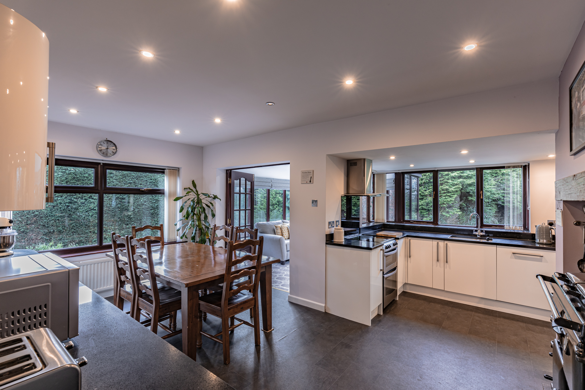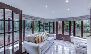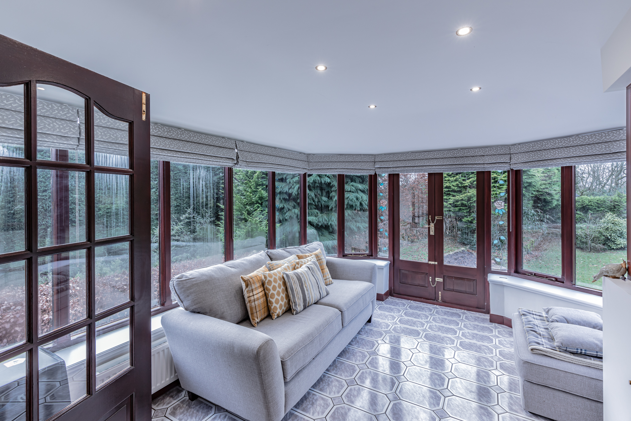 Double doors from the dining kitchen open into a bright conservatory, where a multitude of windows provide garden views, drawing them in. Throw the doors open in the summer months for harmony between the outdoors and in.