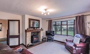 Within the bespoke, feature stone fireplace, an electric log burning stove emanates warmth and welcome. Carpeted and neutral in its décor, this is a room where the windows frame the feature artwork of the surrounding countryside.