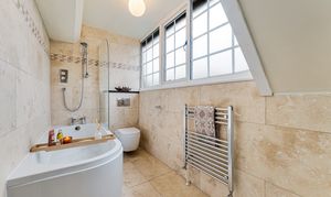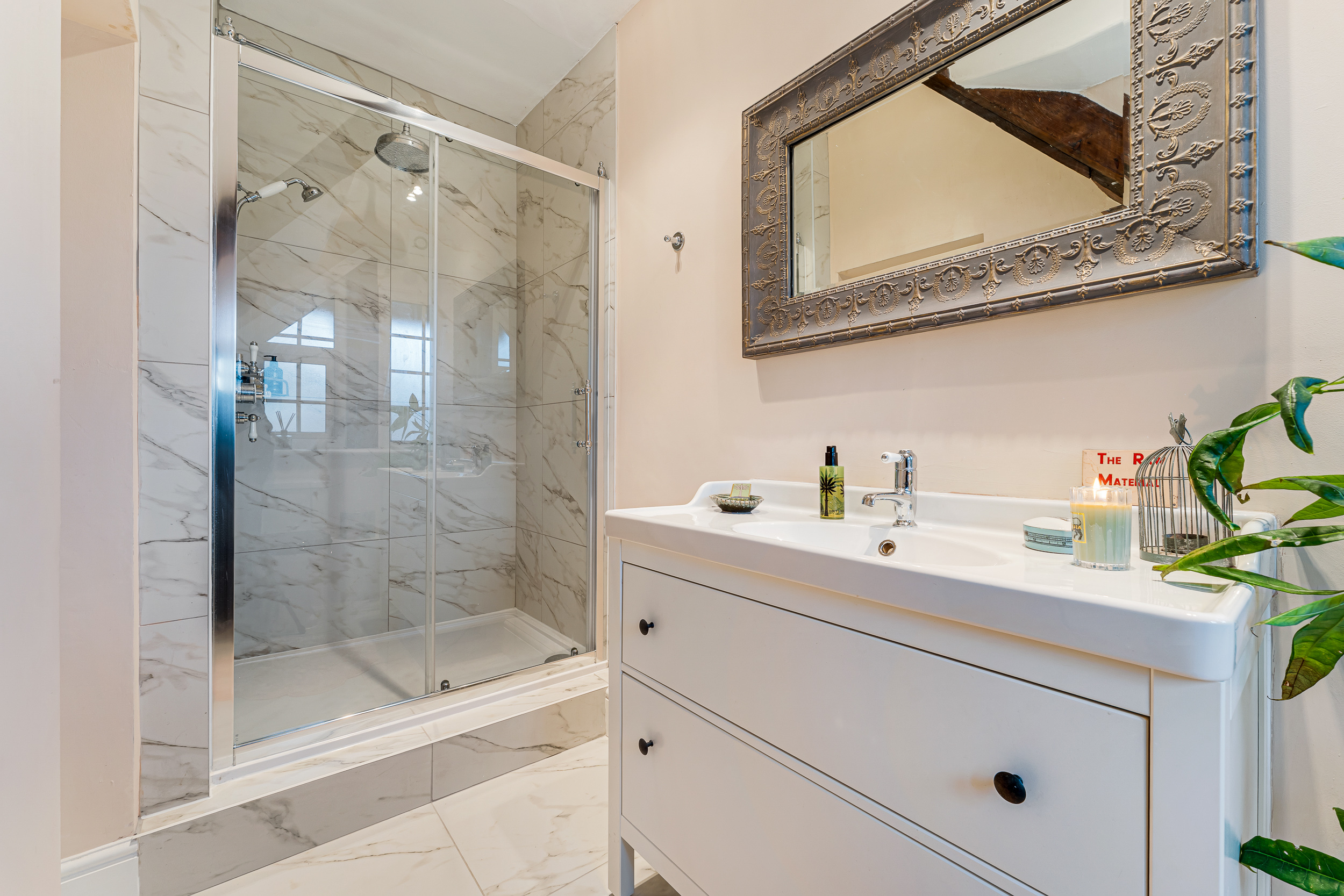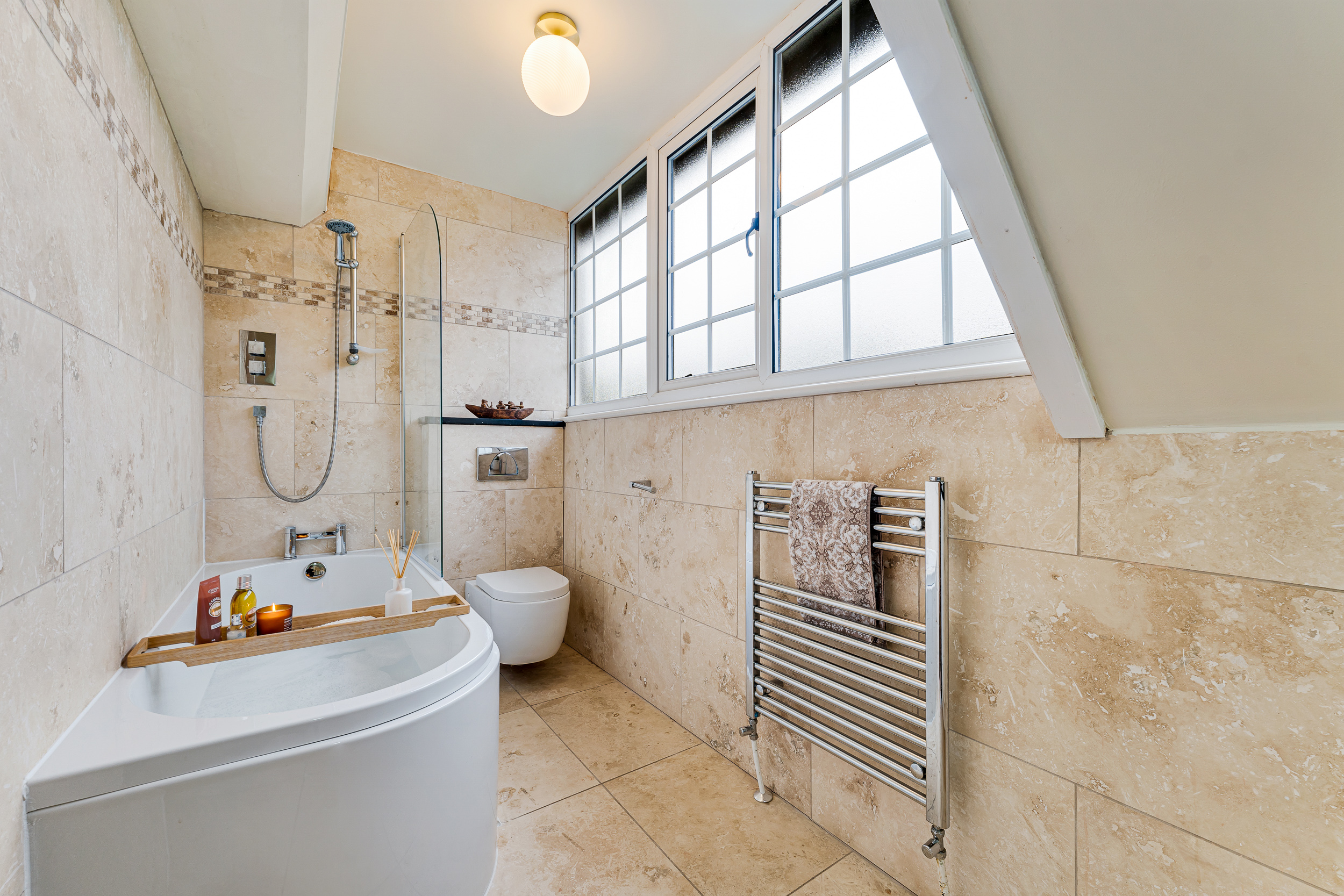 Returning along the landing, opposite the stairs, the refurbished bathroom is tiled in cream, with plenty of storage beneath the wash basin. Light and bright, soak in the ambience, with a mains-fed power shower over the recently fitted bath.