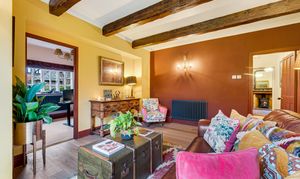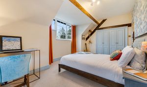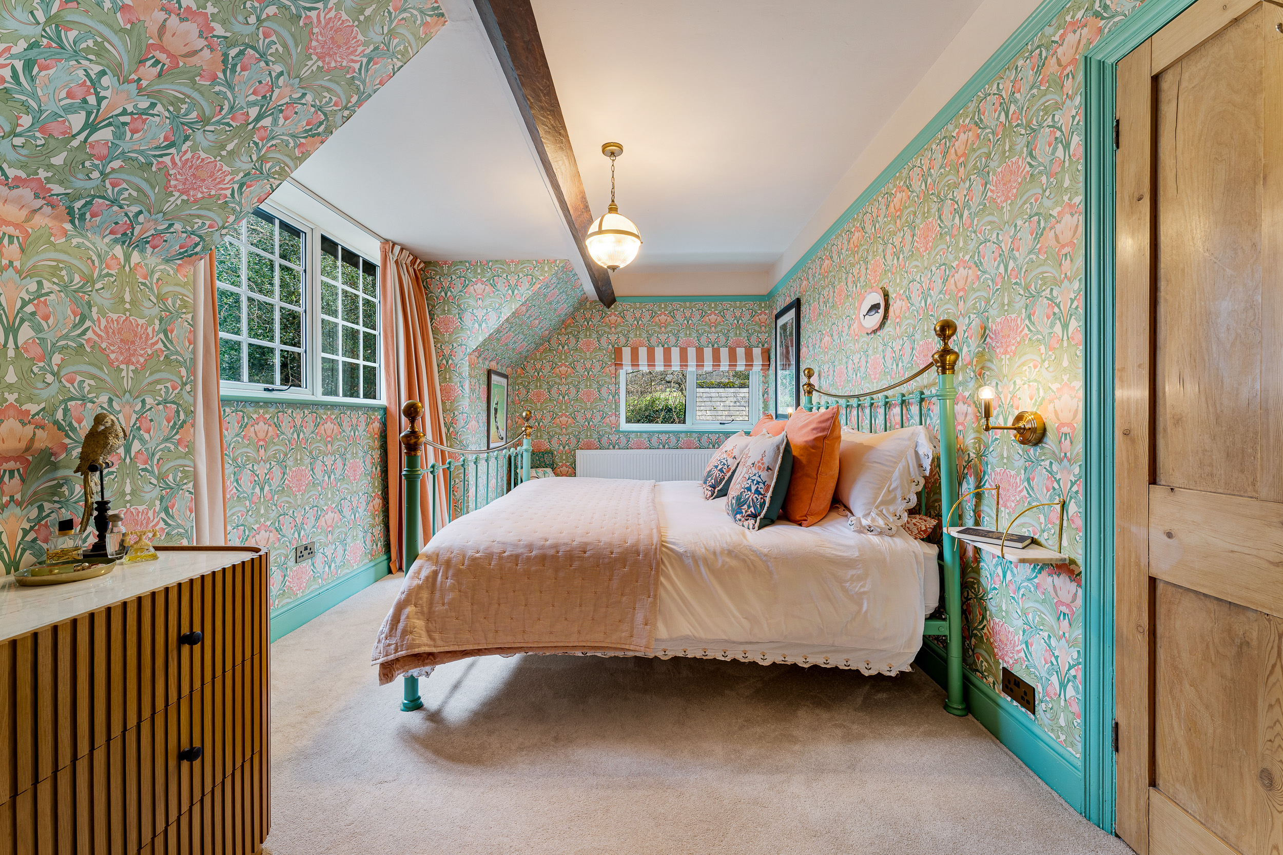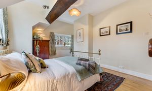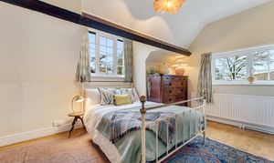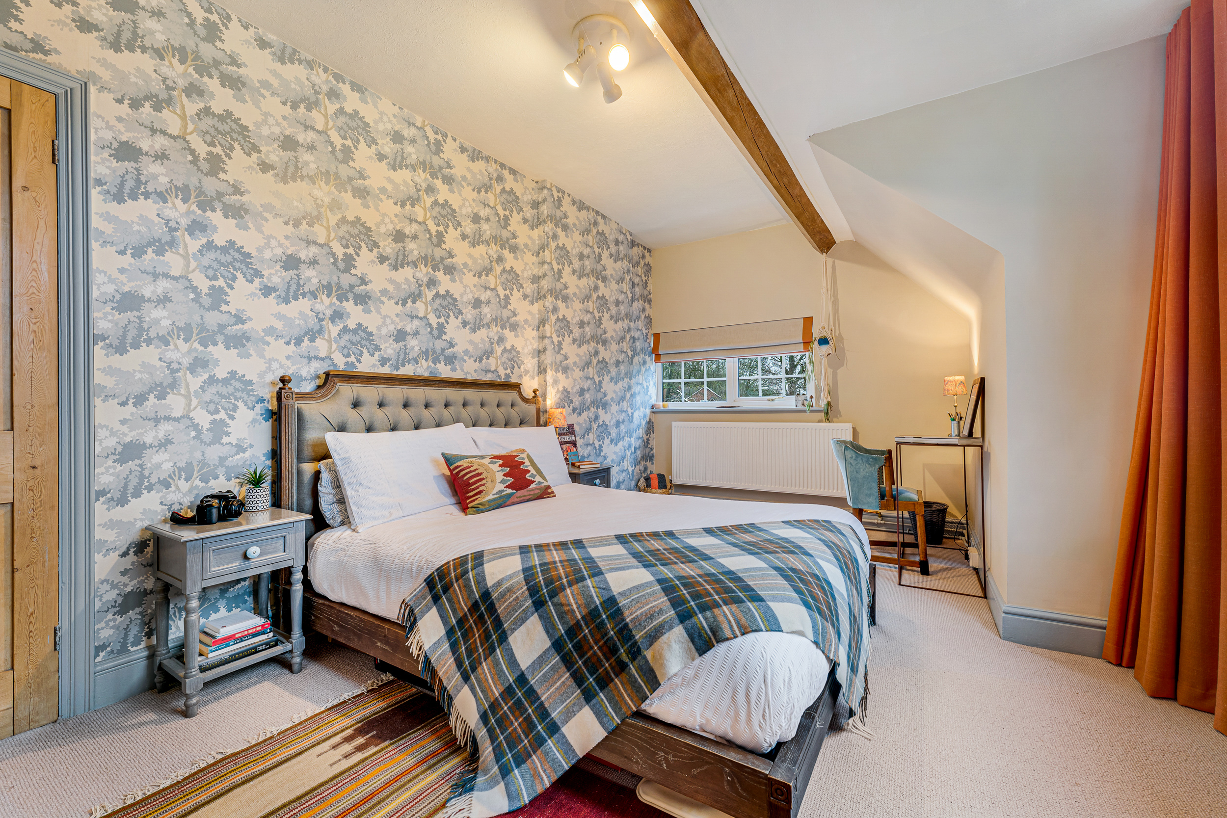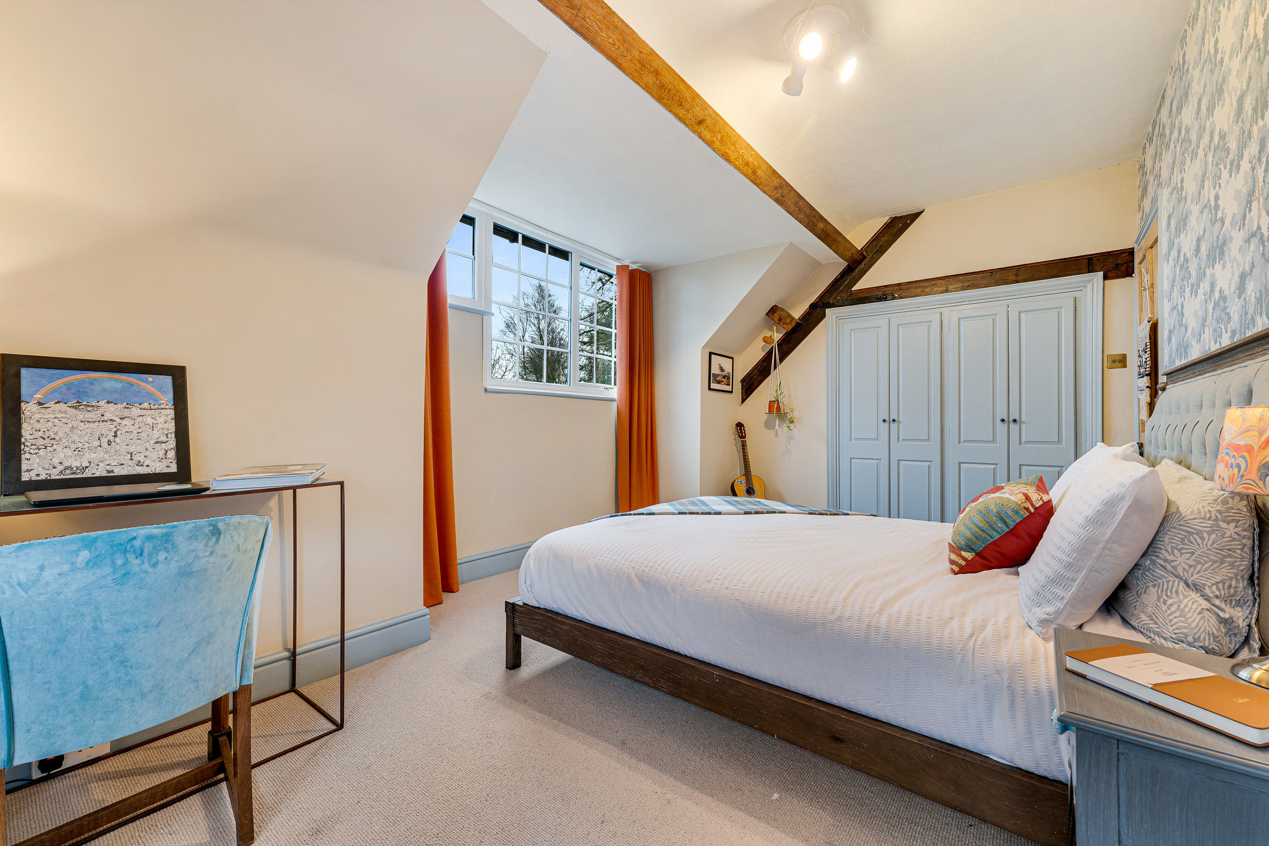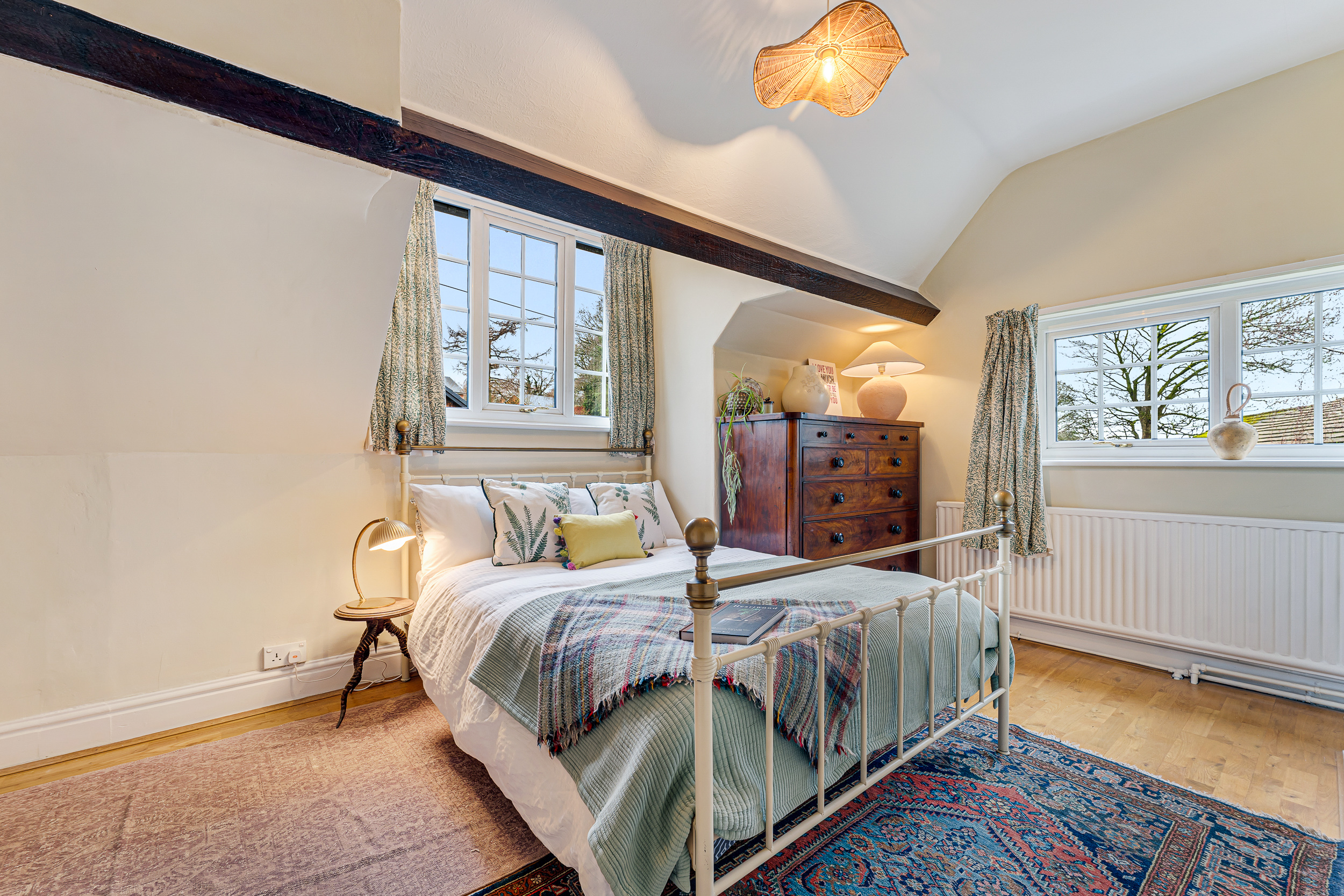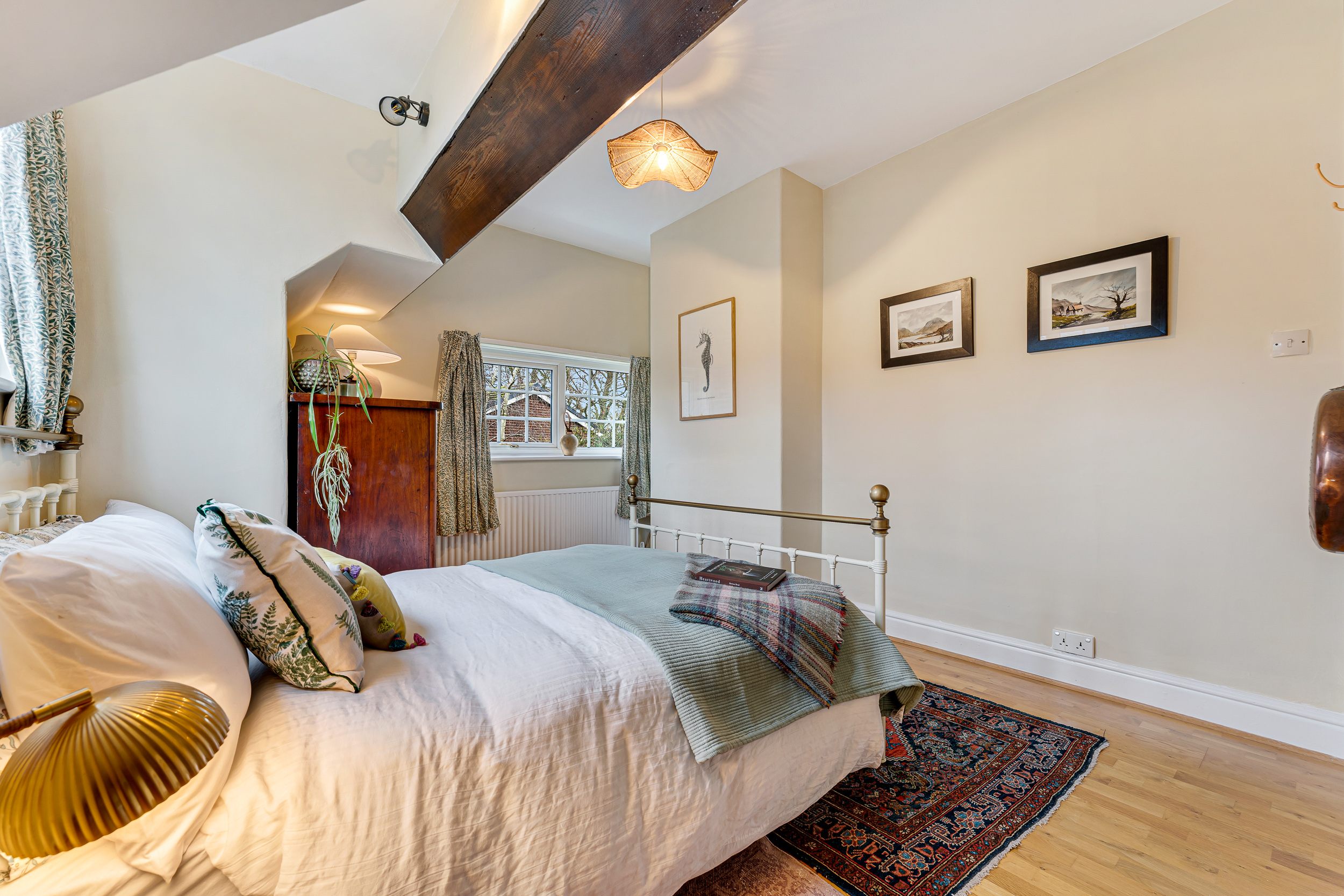 Next door, a second spacious bedroom looks out over a seating area in the garden, again with exposed beam and plenty of character.