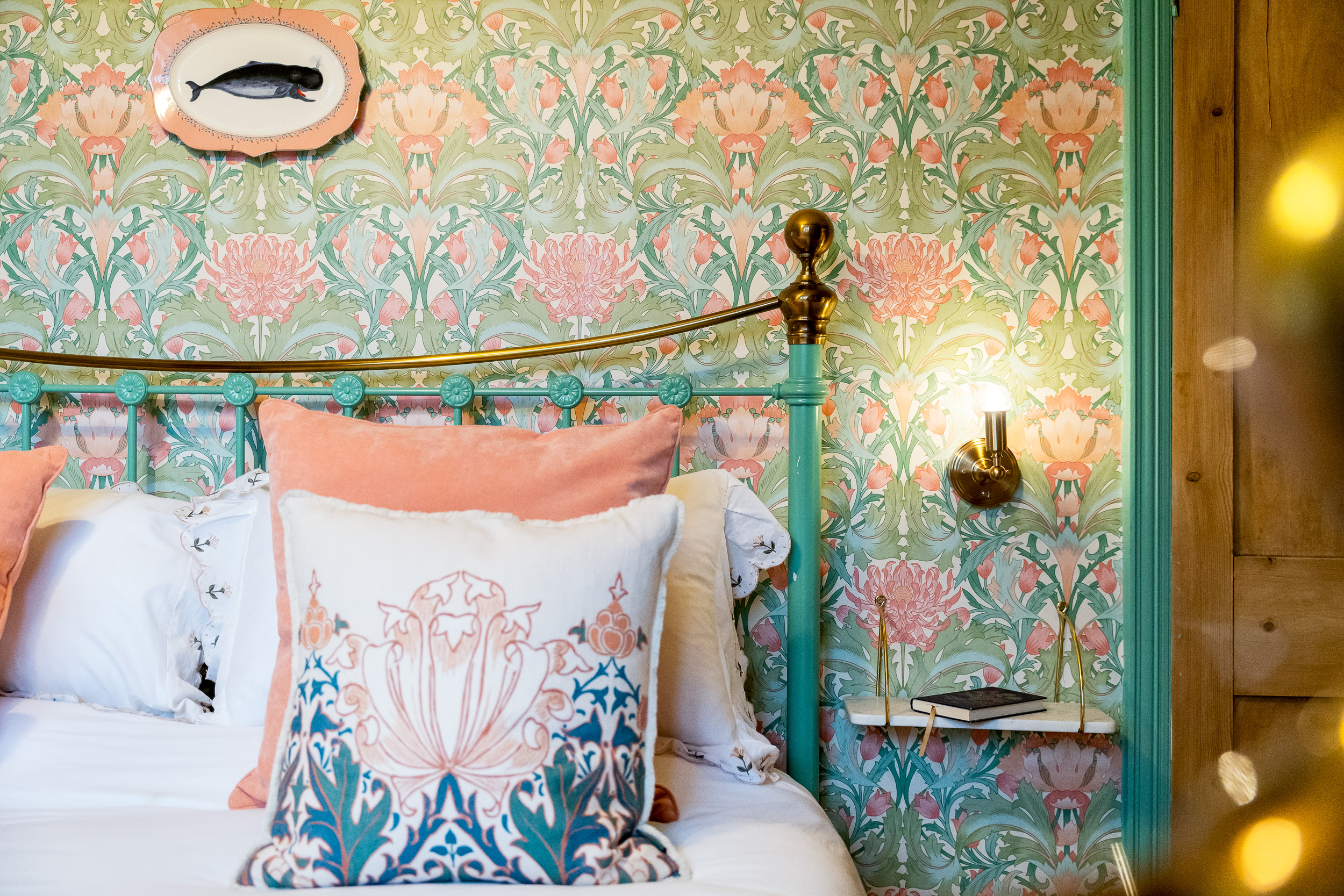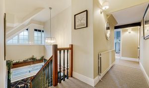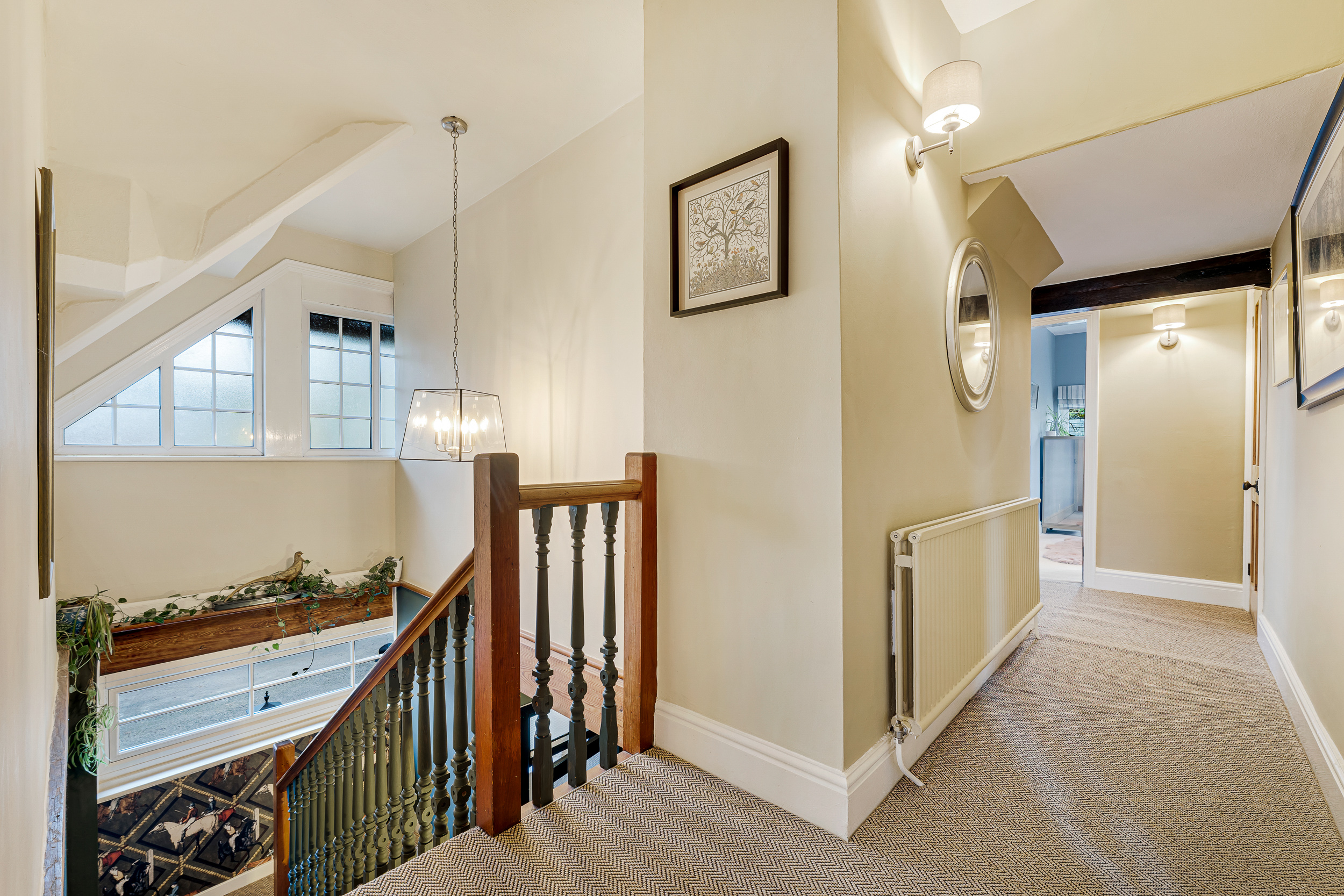 Rising up through the entrance hall, the Victorian-style newels lend period presence to the staircase, dressed in a newly fitted herringbone carpet runner. A window on the turn draws in natural light, illuminating the wallpapered ascent and highlighting the craftsmanship as it rises to the landing, where exposed beams frame the space above to the right.