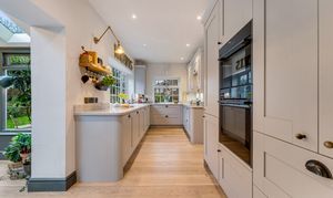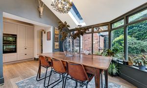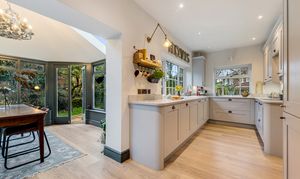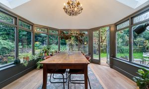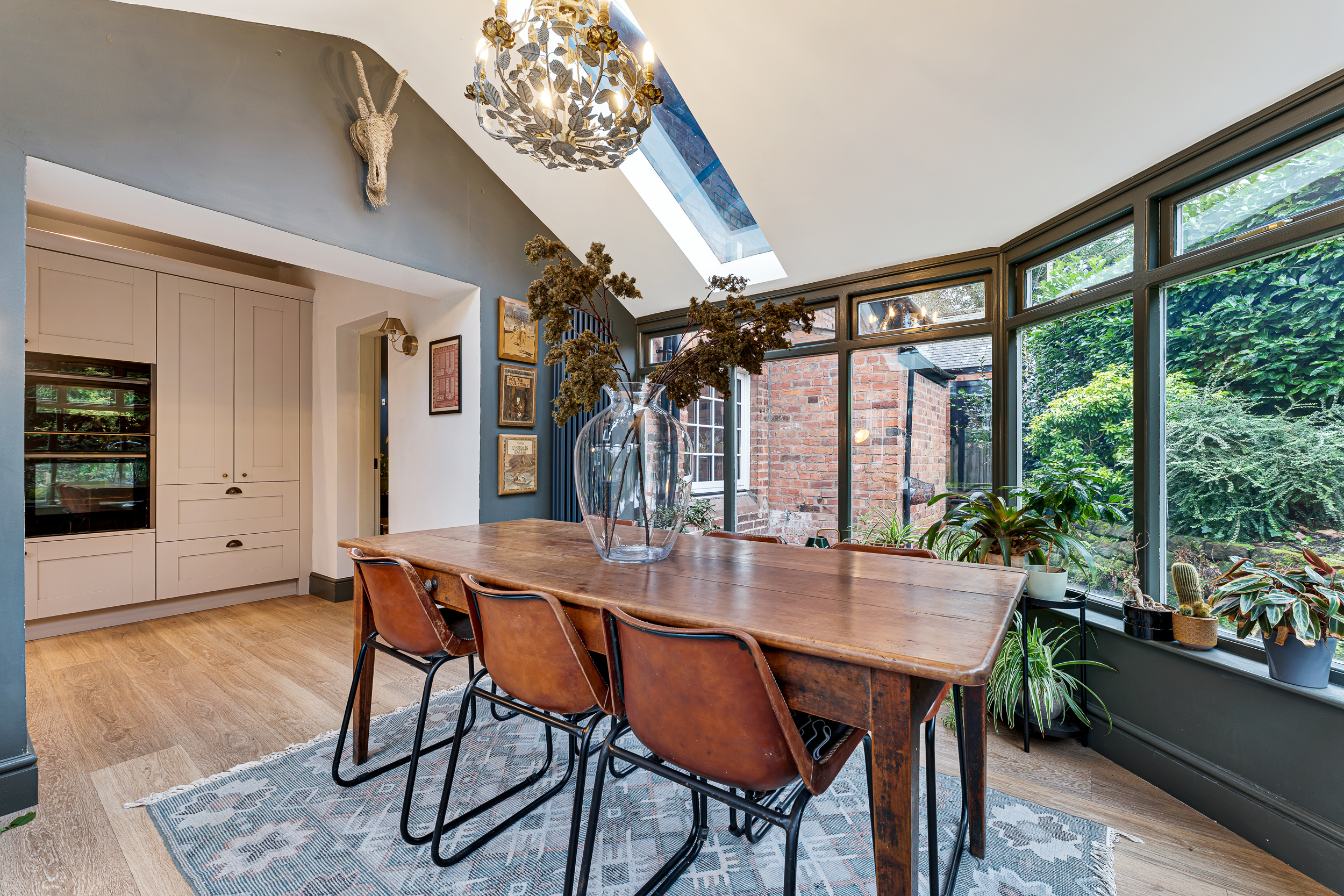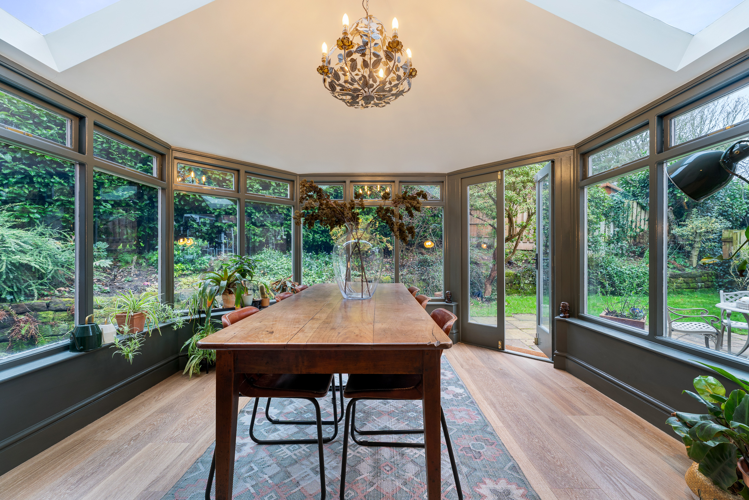 Opening up from here, the kitchen flows seamlessly into a spacious orangery dining room, now fitted with a solid roof and encircled by windows framing leafy views of the garden. Previously arranged as a seating area, the space has been reimagined to create a more natural connection between cooking, dining and entertaining, with light flooding in from windows above and French doors offering instant access out when dining al fresco in summertime.