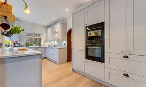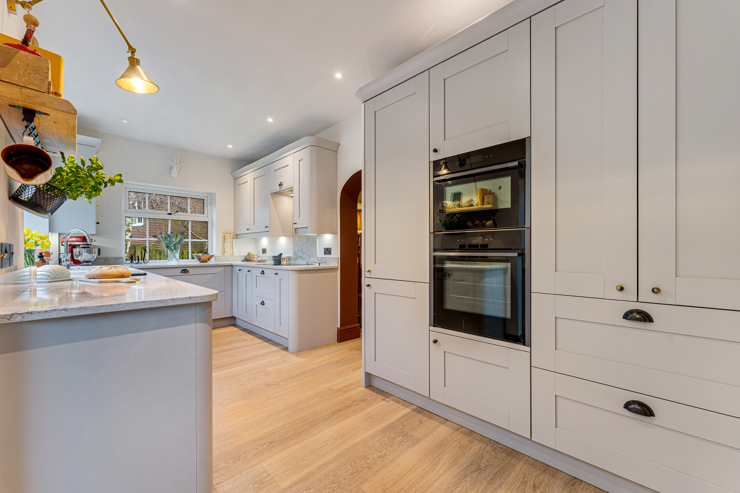 Across the entrance hall, step into the kitchen, furnished with a host of integrated appliances including Neff slide-and-hide ovens, a Neff combi microwave, induction hob and fridge freezer, alongside a Bosch dishwasher. A Franke instant boiling tap and pull-out bin elevate this kitchen for modern living, while double doors open to a dedicated breakfast pantry cupboard, offering seamless storage and ensuring clutter-free mornings.