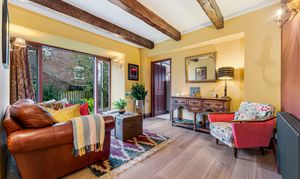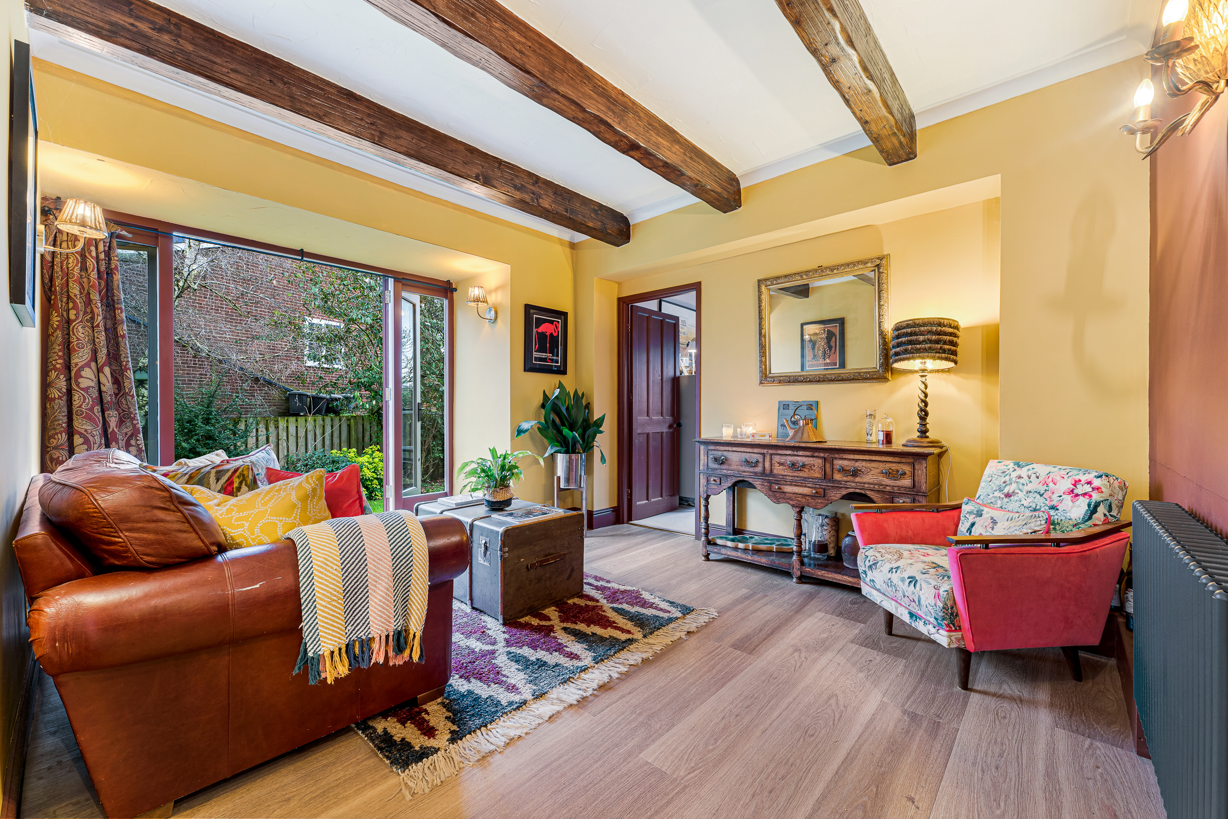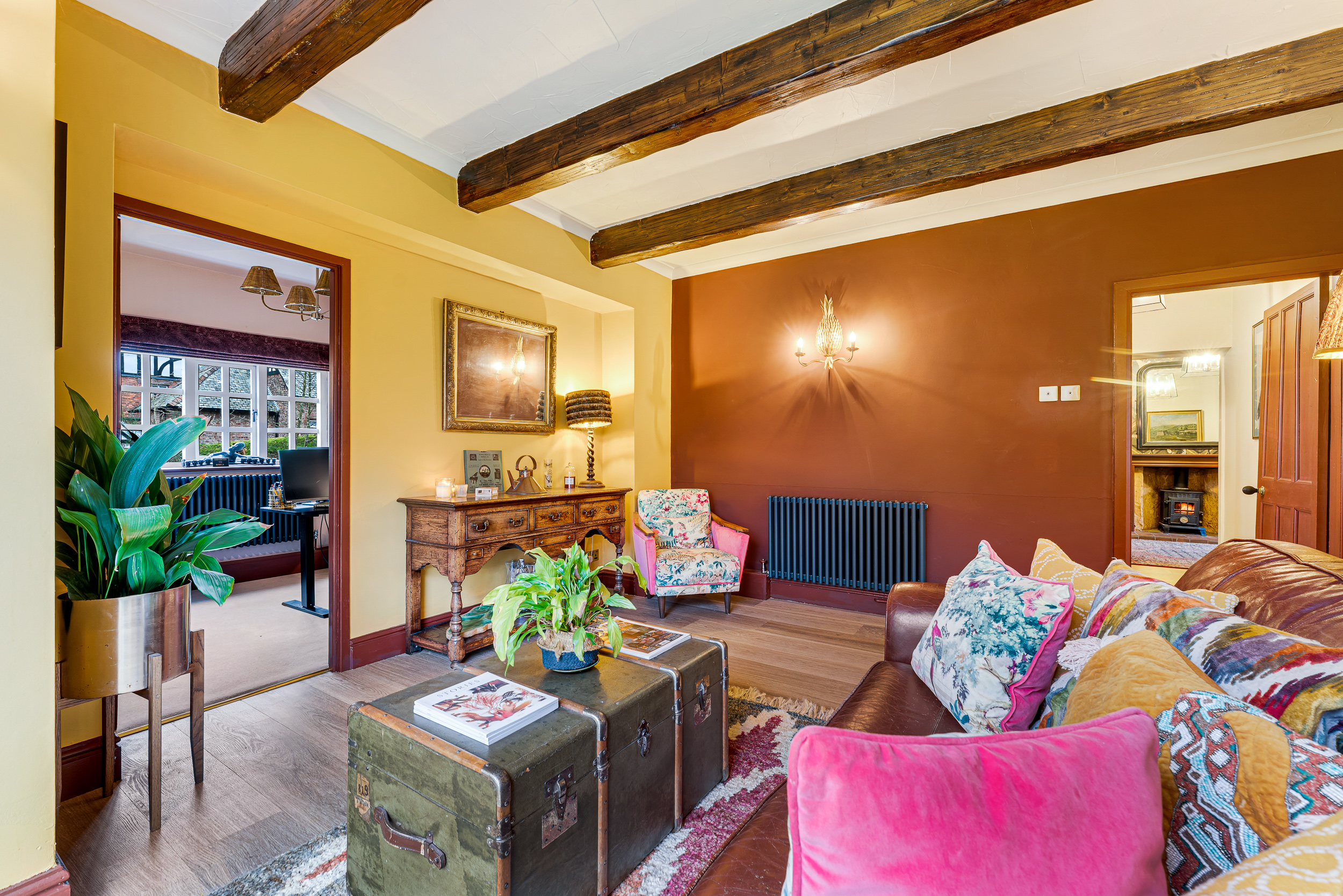 Returning to the kitchen, beneath an archway the cosy rear snug beckons, bedecked in beams above and overlooking the garden. Bathed in gentle morning light through French doors to the patio, the snug provides the perfect spot for the first coffee of the day, or a secluded spot for the weekend crossword. Versatile in its use, it could equally serve as a playroom or relaxed family room, adapting easily to changing needs.