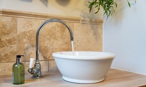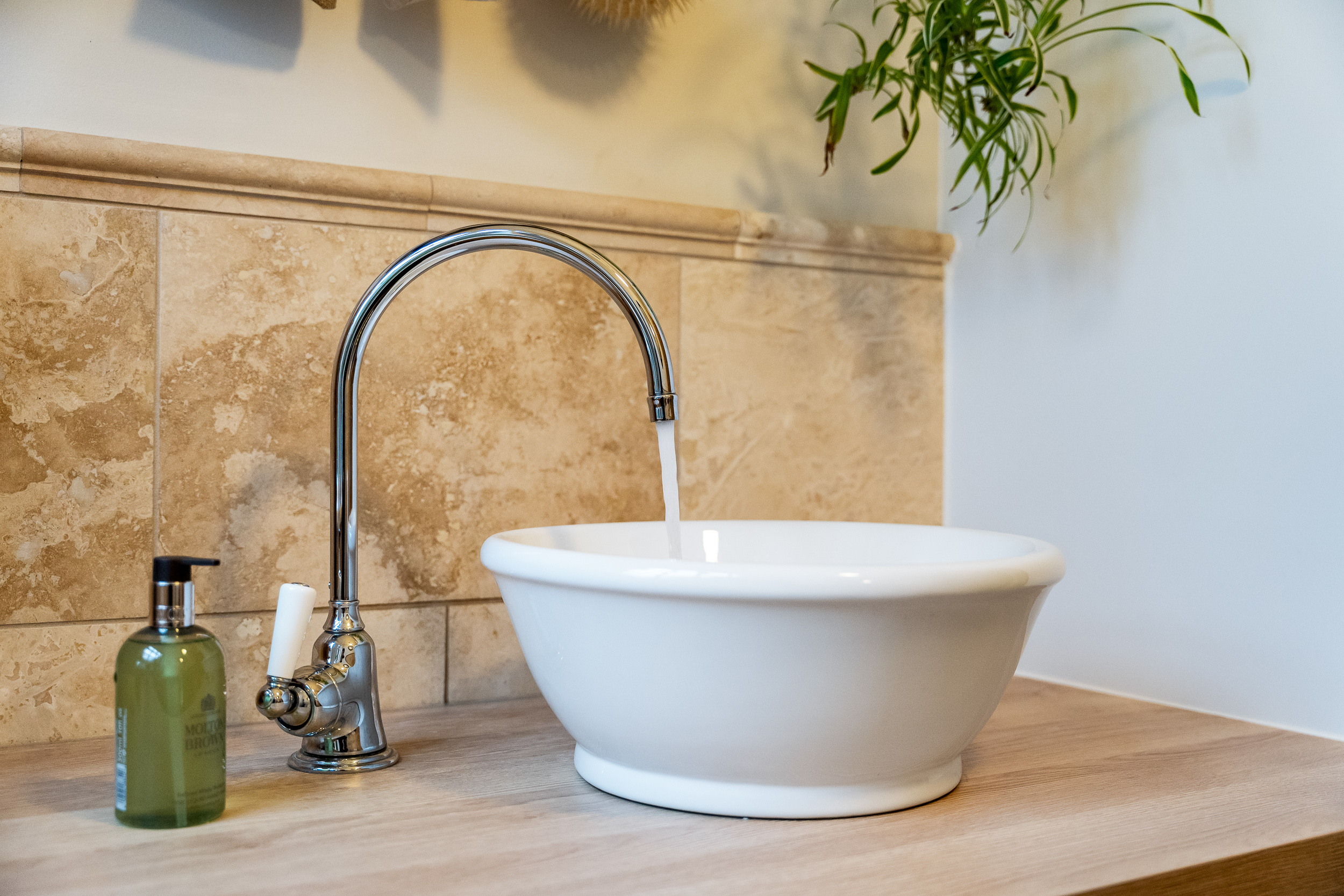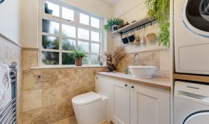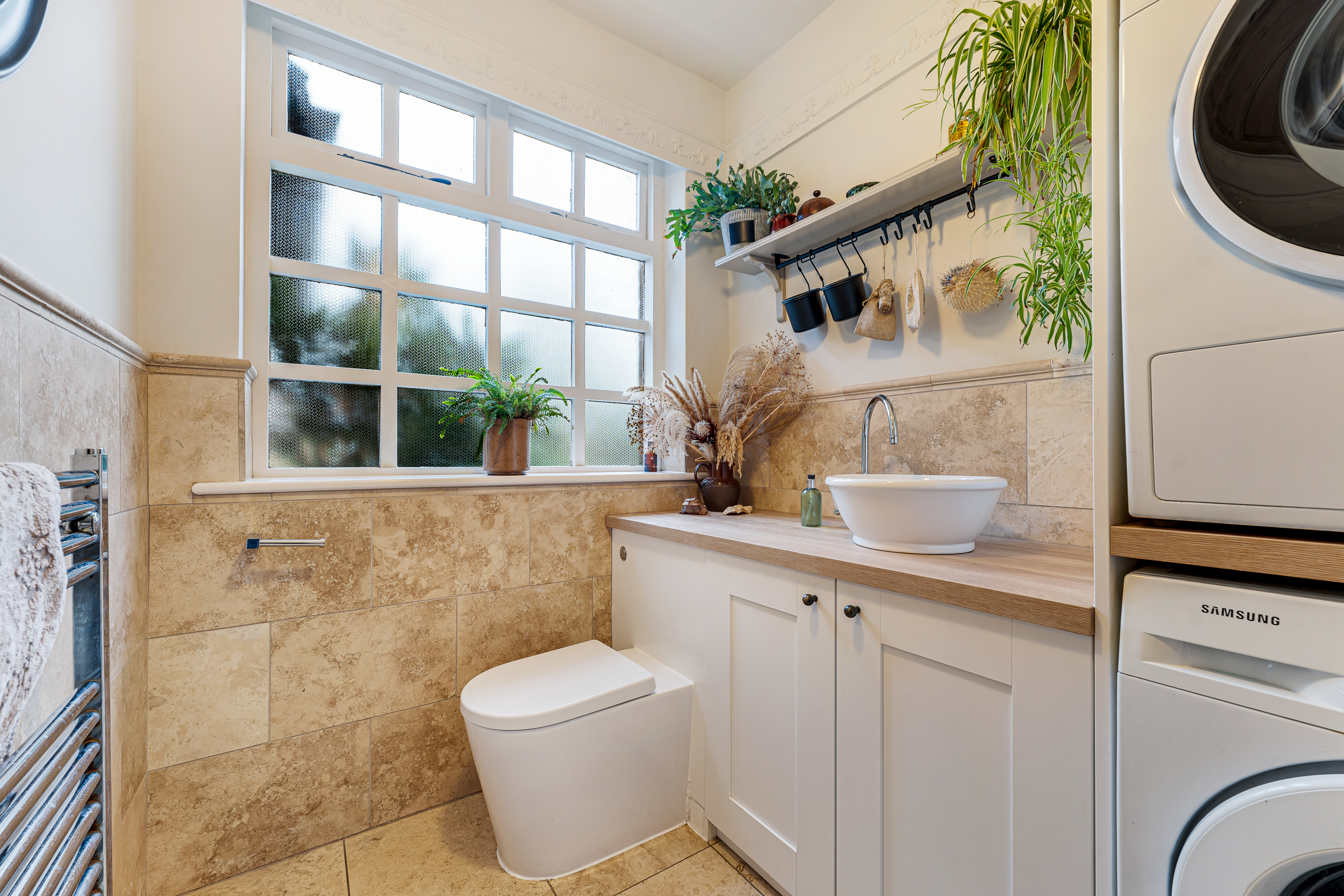 Returning to the main entrance hall via a doorway in the snug, sneak a peek at the half tiled, elegantly finished laundry room with WC, Neptune basin and tap.