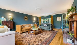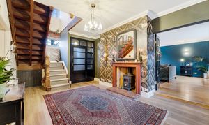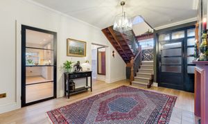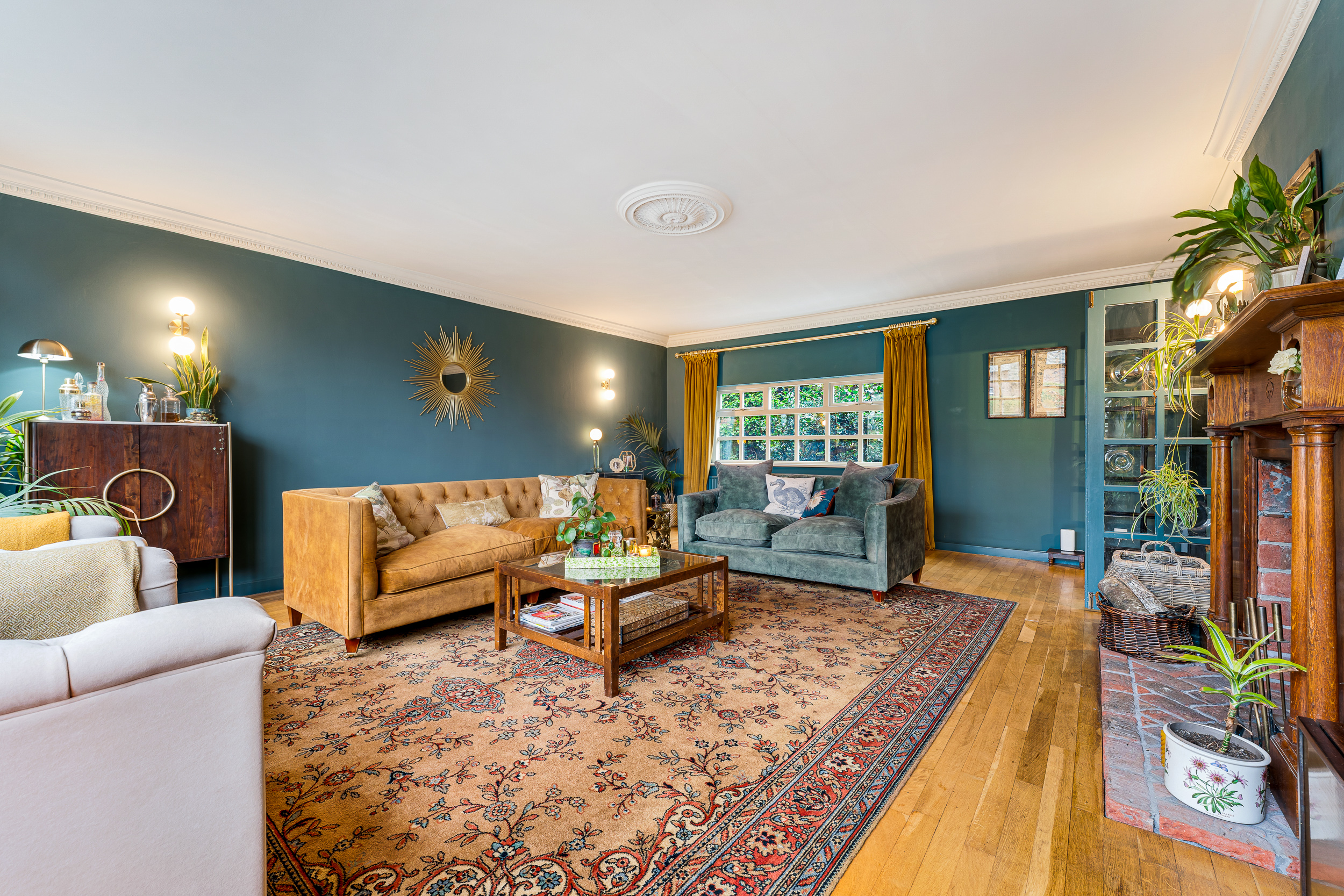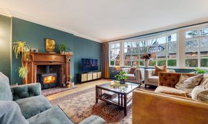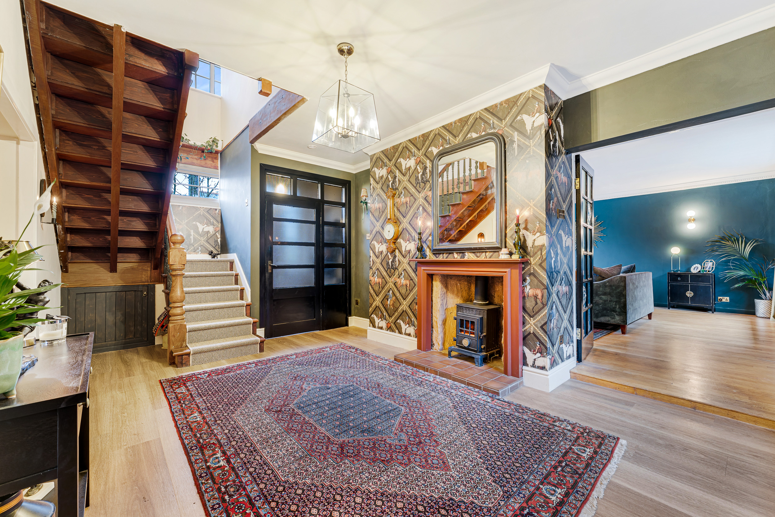 The wallpaper in the hall and along the staircase, chosen as a subtle nod to the home’s origins as former stables, captures the essence of Eversley Lodge’s history, while elsewhere the décor leans toward Art Deco, rich, heritage tones of burgundy, mustard and deep green create a refined warmth that suits the period beautifully. With the majority of rooms enjoying two windows and consistently high ceilings, an abundance of natural light allows the deeper palette to feel rich, balanced and beautifully luminous throughout the day.